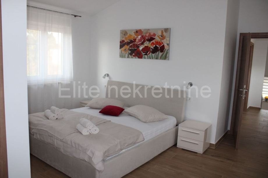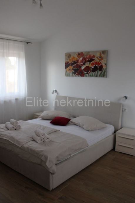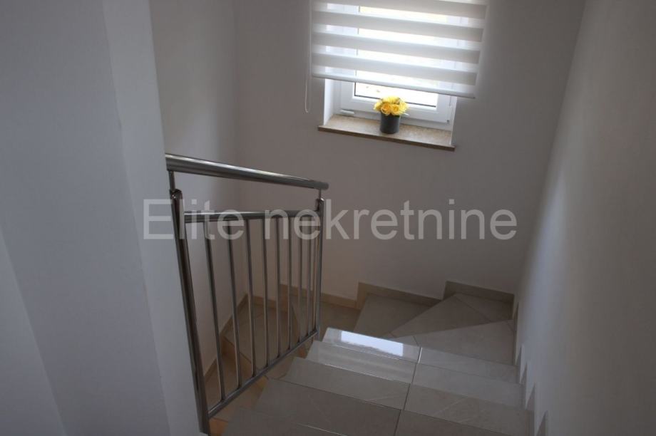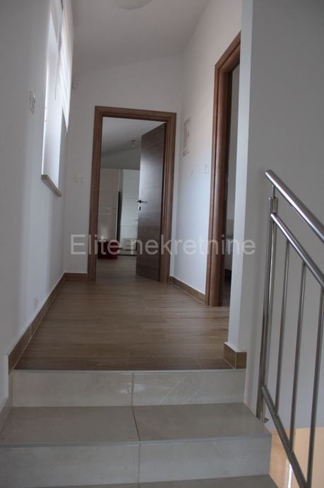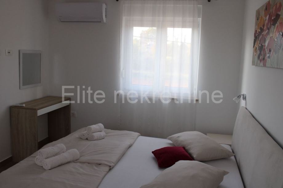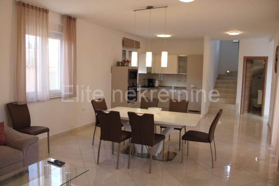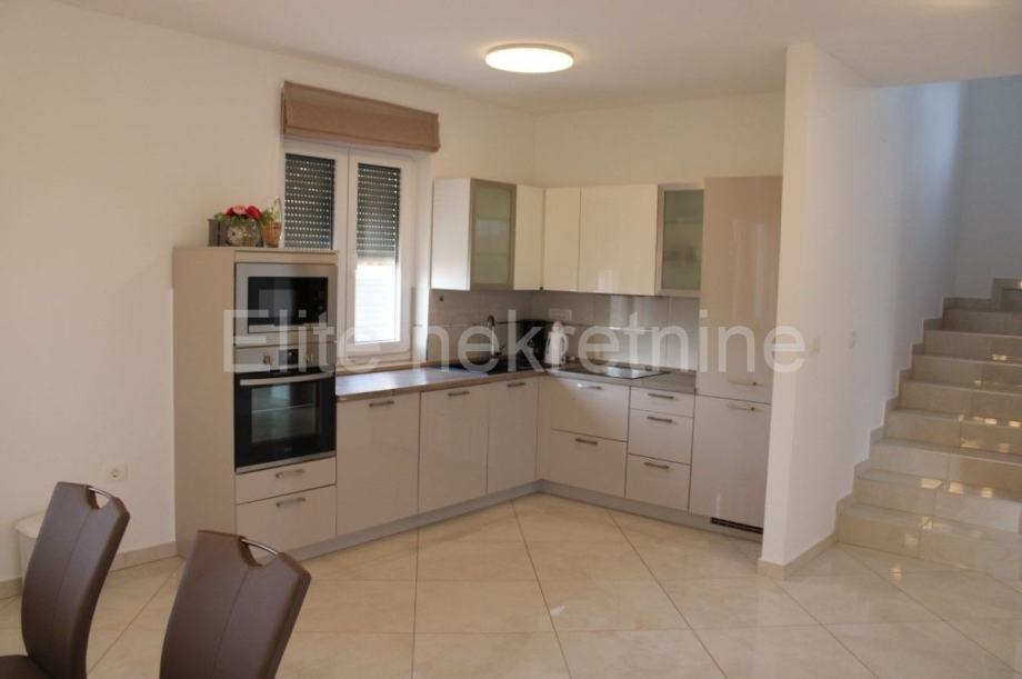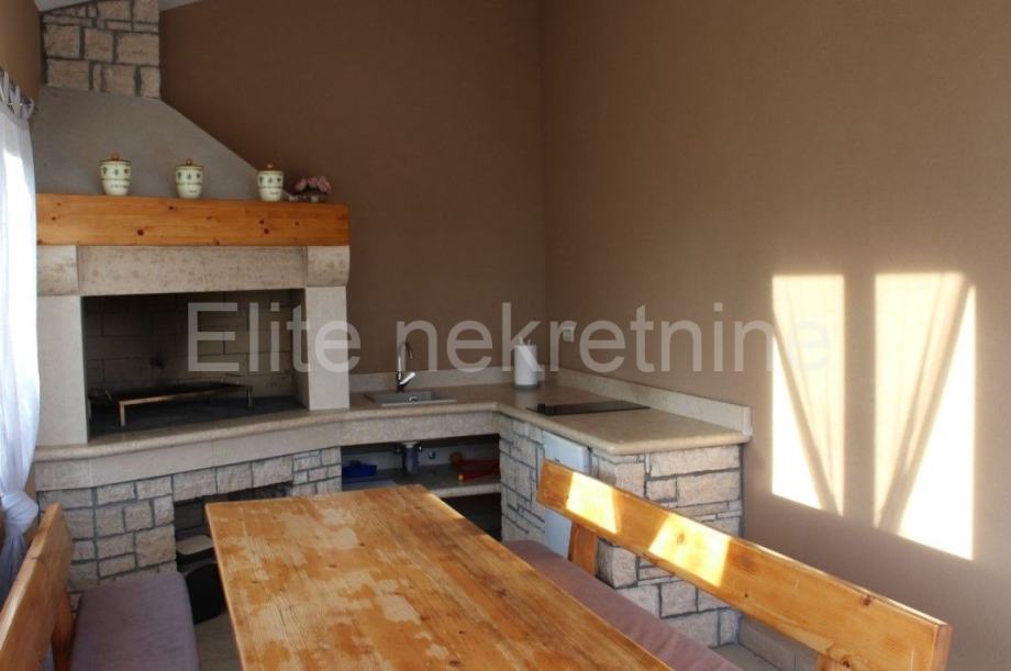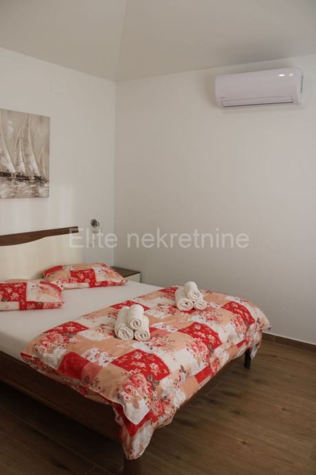 Kompletno namještena kuća stambene površine od 125 m2 proteže se na prizemlje i prvi kat. Prizemlje se sastoji od open space prostora u kojem se nalazi dnevni boravak s izlazom na terasu, blagovaona i kuhinja, wc, kupaonice, jedne velike spavaće sobe s bračnim krevetom i ostave. Na prvom katu su dvije velike spavaće sobe također s bračnim krevetima i zasebnim kupaonicama.