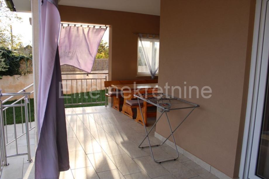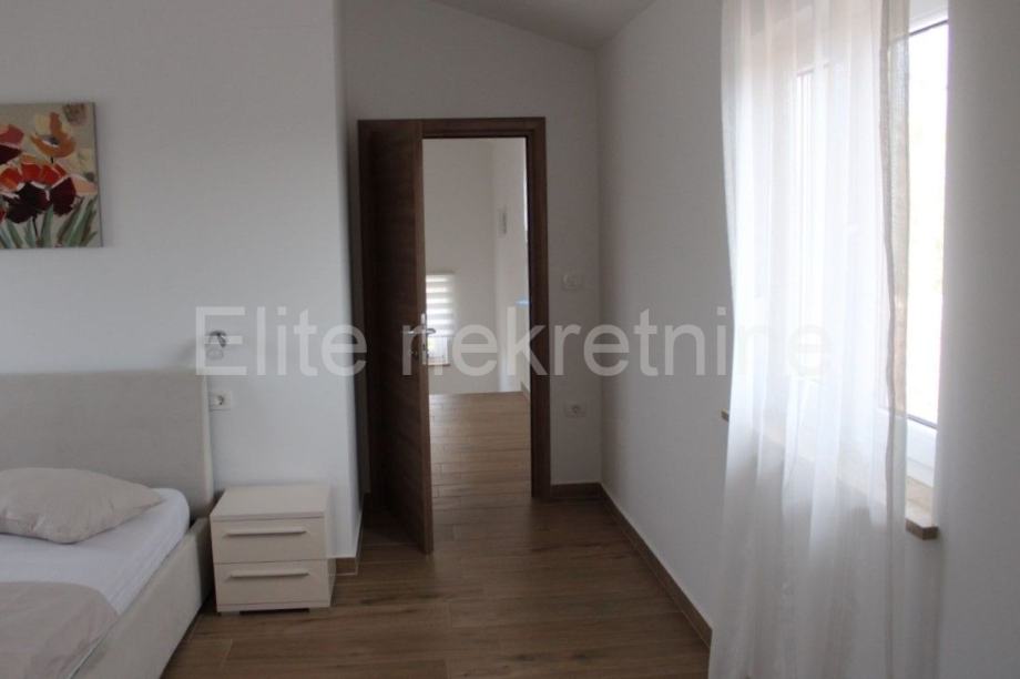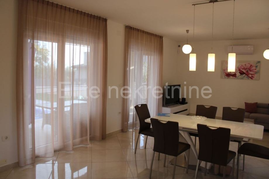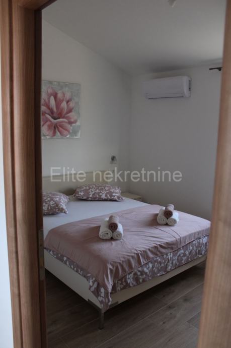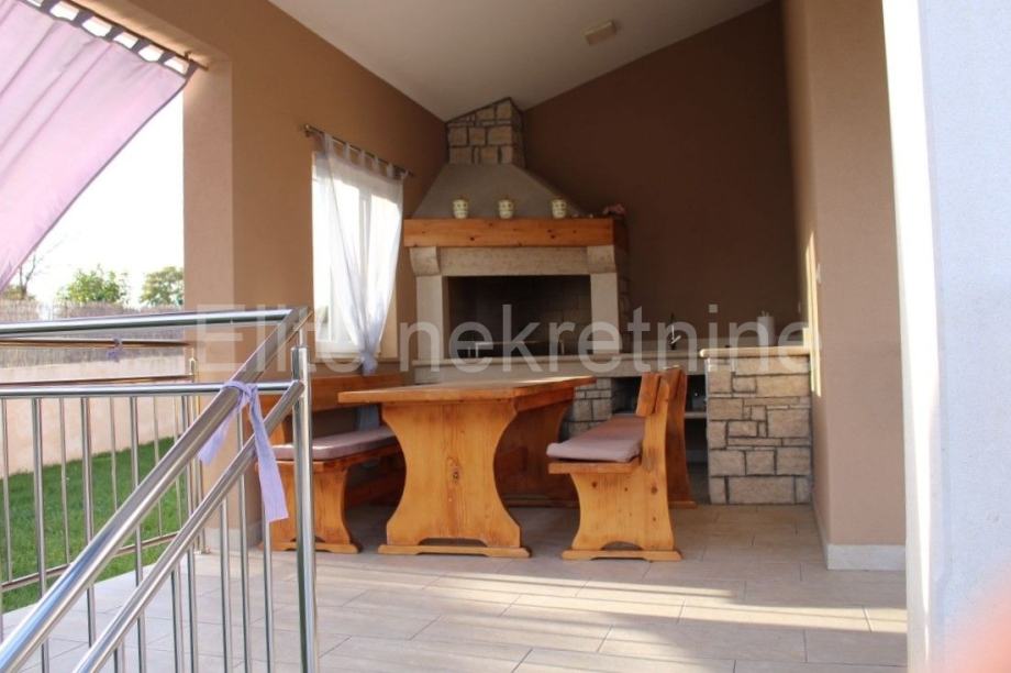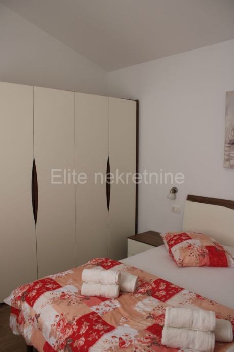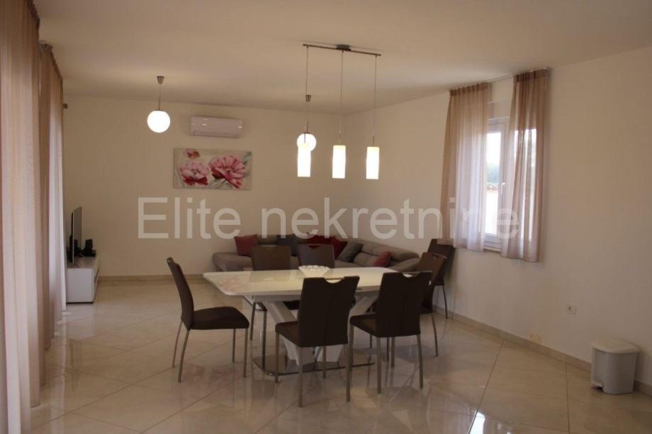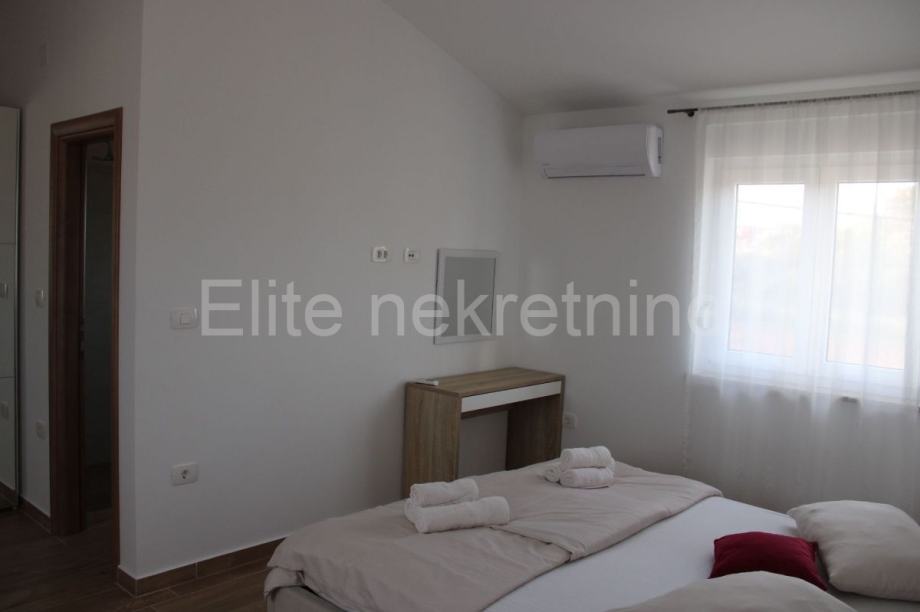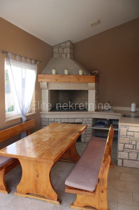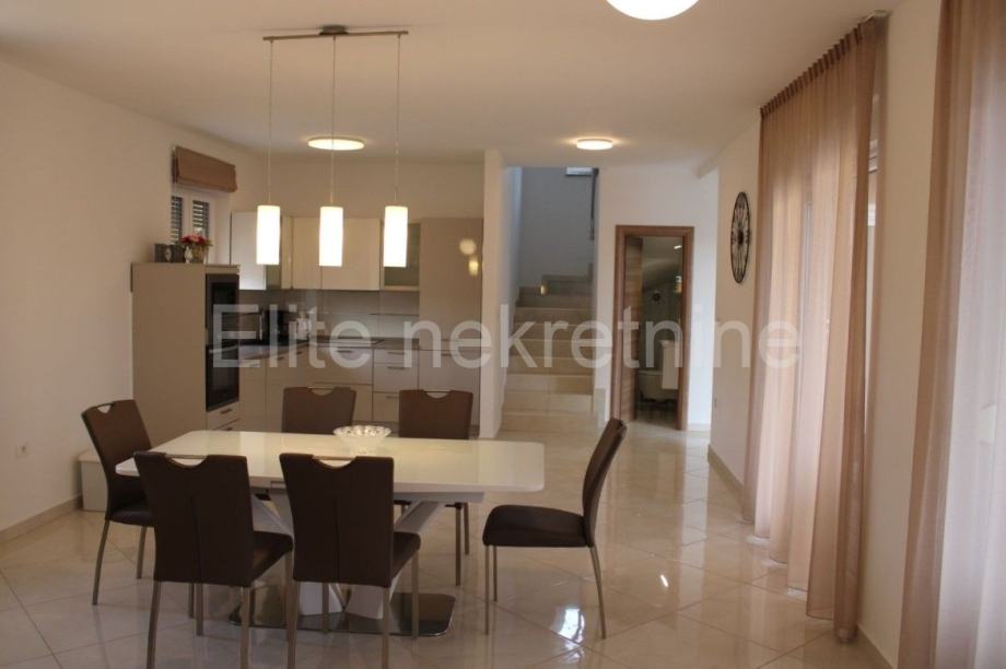Kompletno namještena kuća stambene površine od 125 m2 proteže se na prizemlje i prvi kat. Prizemlje se sastoji od open space prostora u kojem se nalazi dnevni boravak s izlazom na terasu, blagovaona i kuhinja, wc, kupaonice, jedne velike spavaće sobe s bračnim krevetom i ostave. Na prvom katu su dvije velike spavaće sobe također s bračnim krevetima i zasebnim kupaonicama.