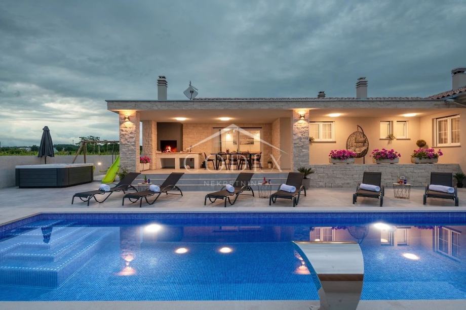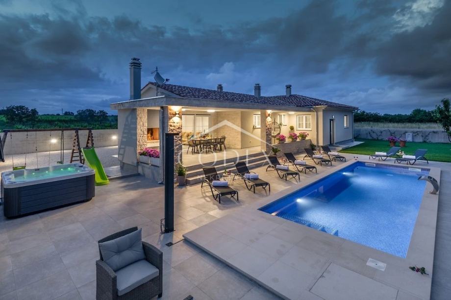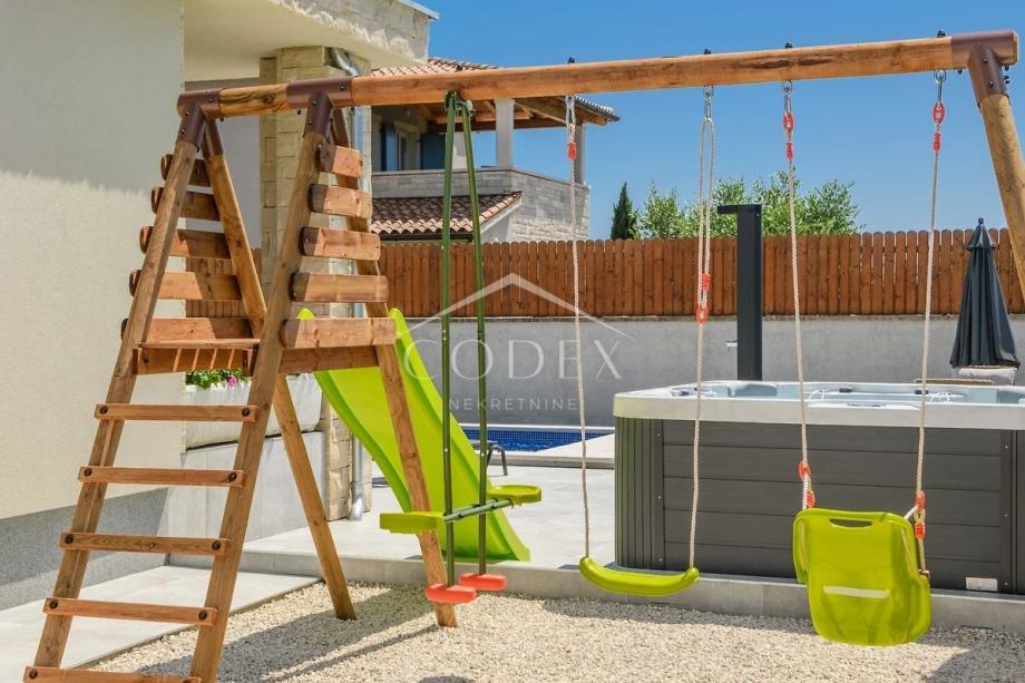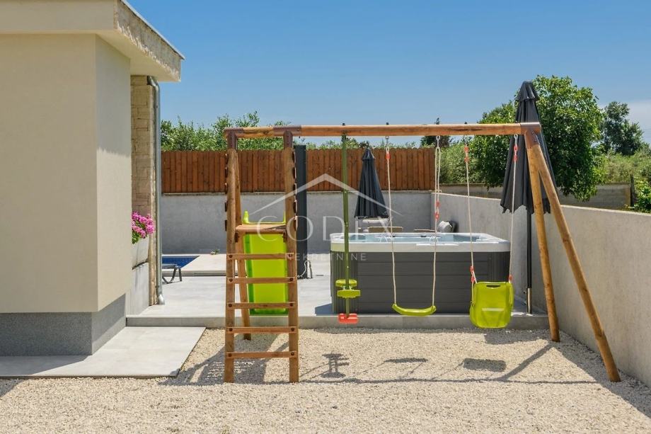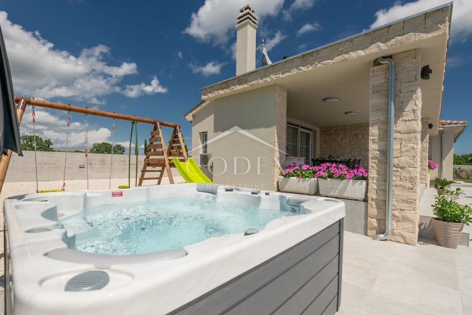 Dodatni sadržaji uključuju jacuzzi, dječje igralište i punionicu za električna vozila, a parkiralište može primiti više automobila.