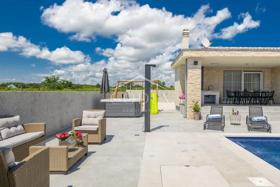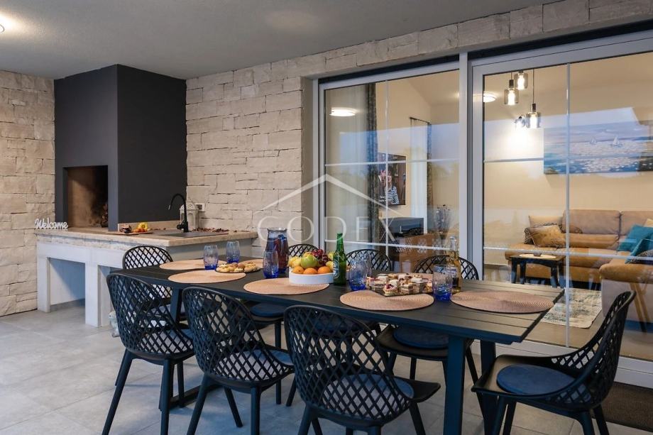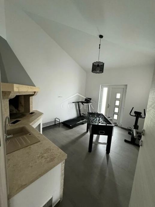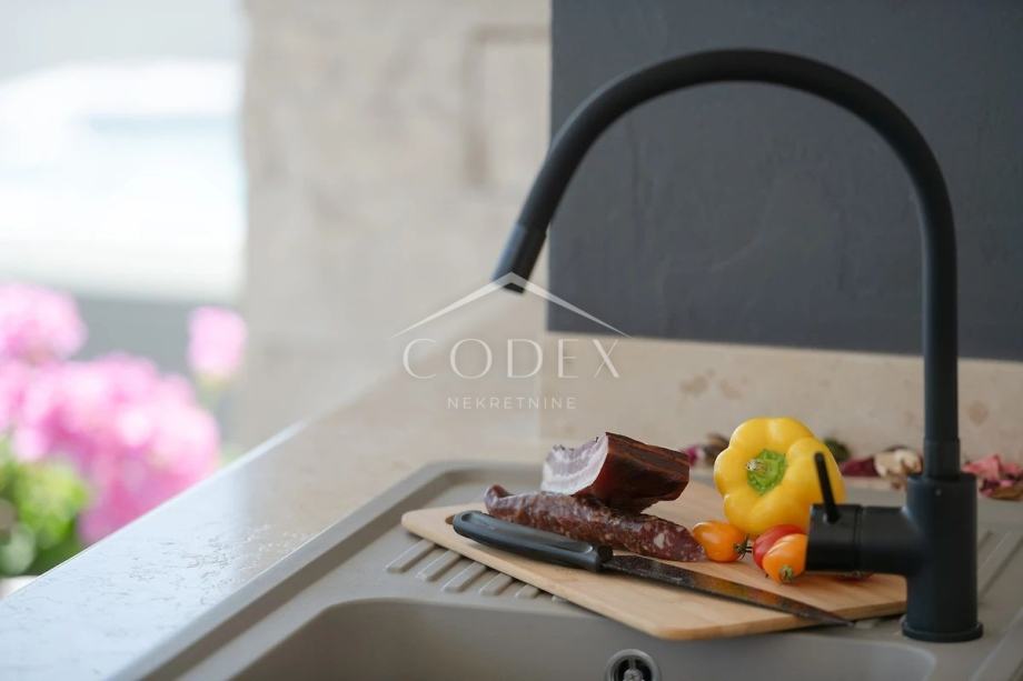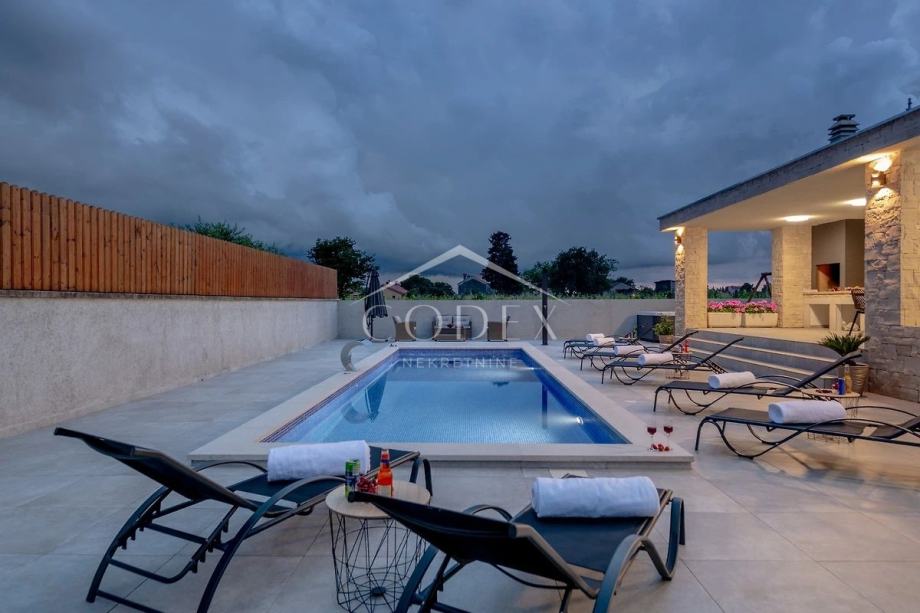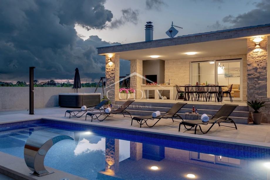 Vanjski dio ima lijepo održavanu travu s automatskim navodnjavanjem te betonirani pristup od ulaza do parkirališta, predviđenog za tlakavac. Uz kuću se nalazi sunčalište s bazenom površine 28,50 m² (9,5x3 m) te strojarica za bazen s potrebnom opremom.