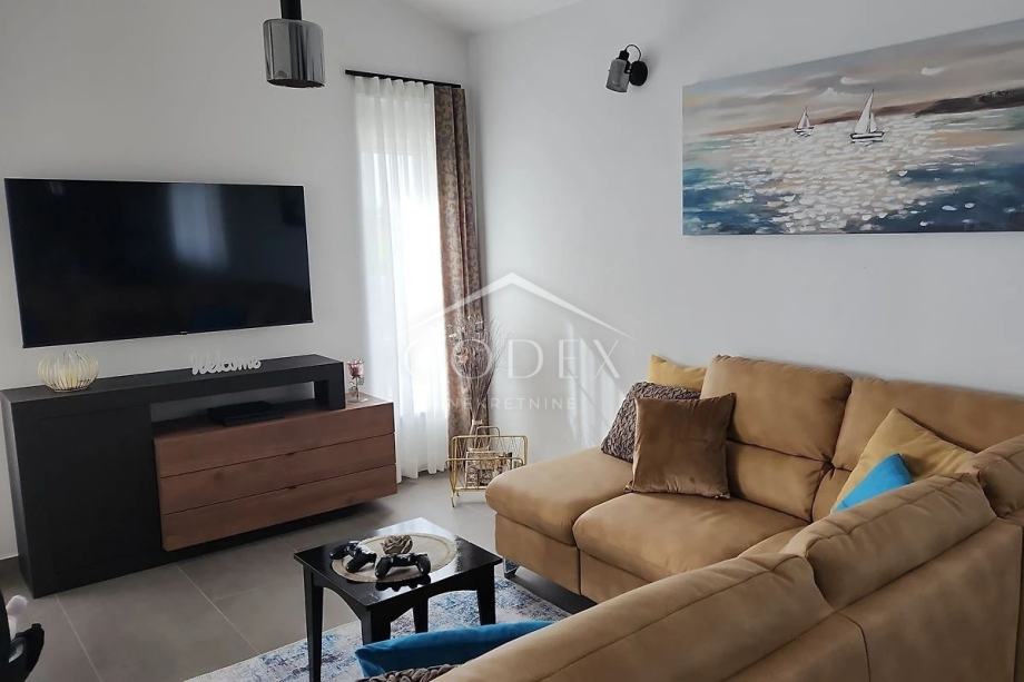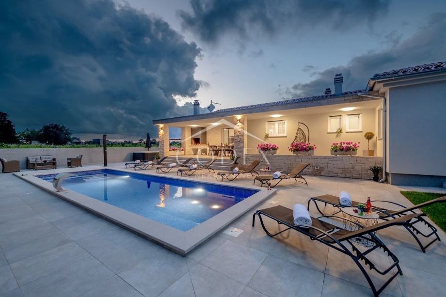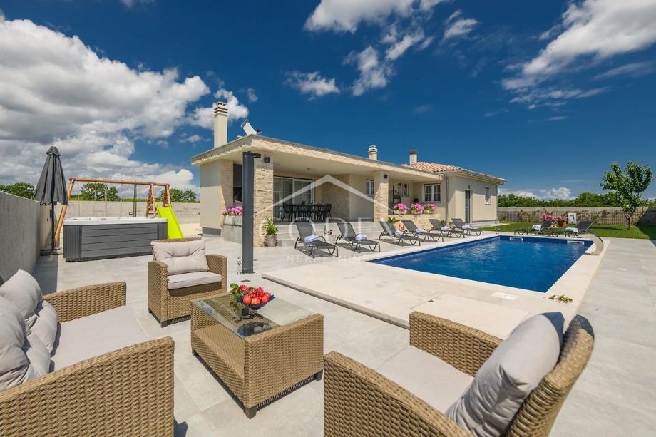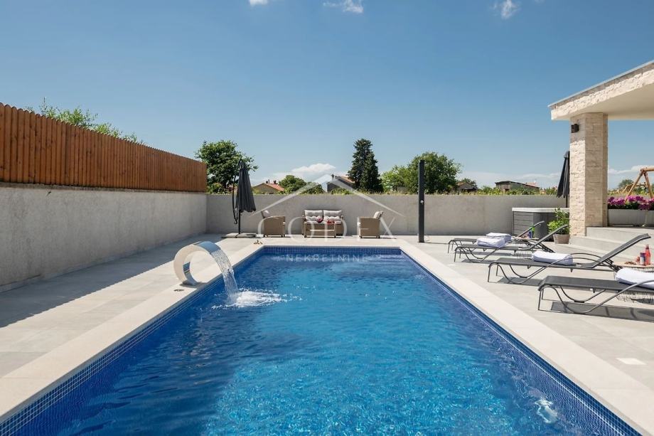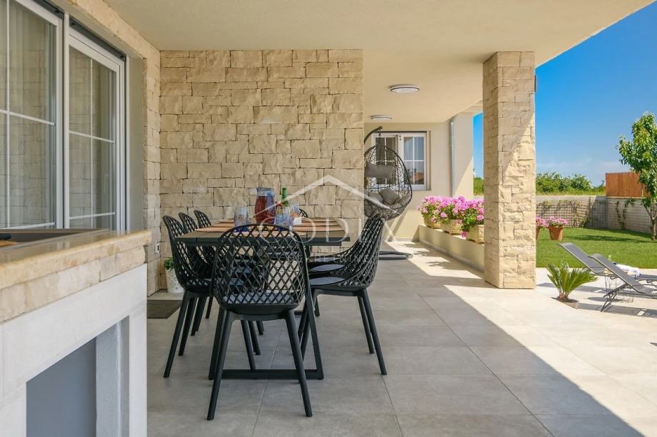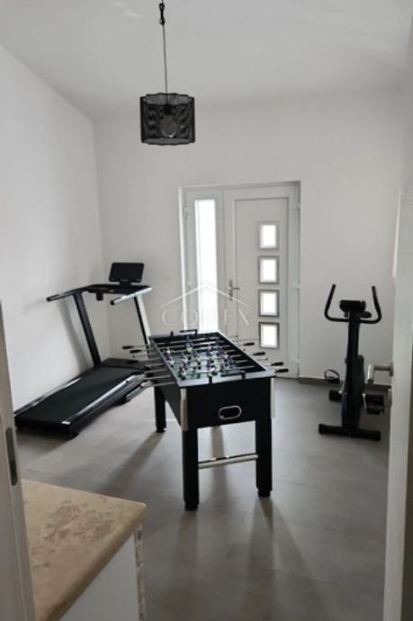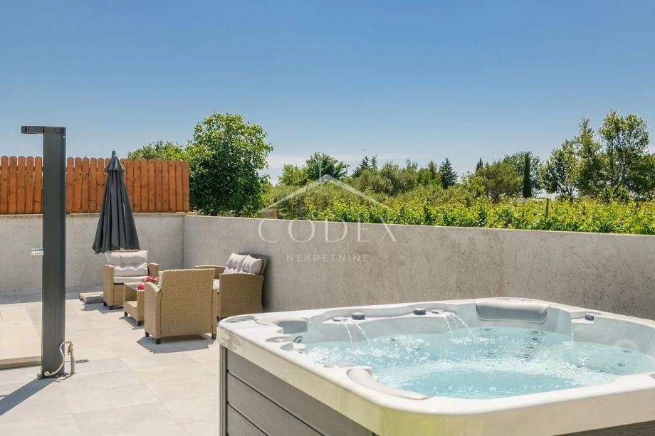 Vanjski dio ima lijepo održavanu travu s automatskim navodnjavanjem te betonirani pristup od ulaza do parkirališta, predviđenog za tlakavac. Uz kuću se nalazi sunčalište s bazenom površine 28,50 m² (9,5x3 m) te strojarica za bazen s potrebnom opremom.