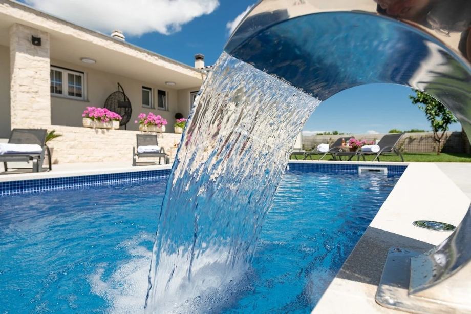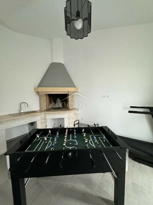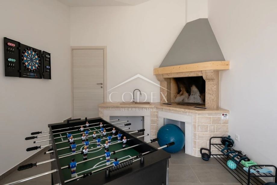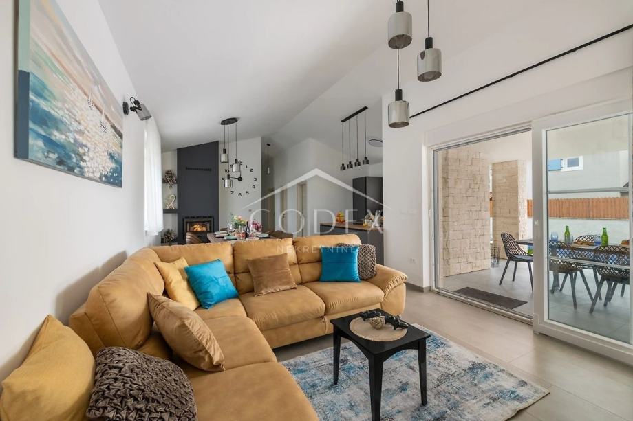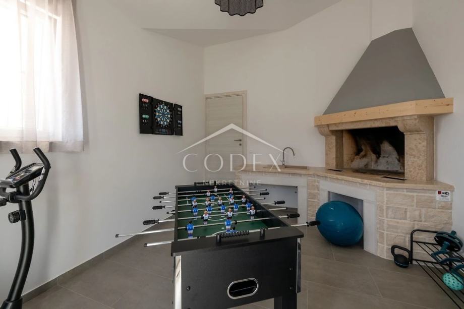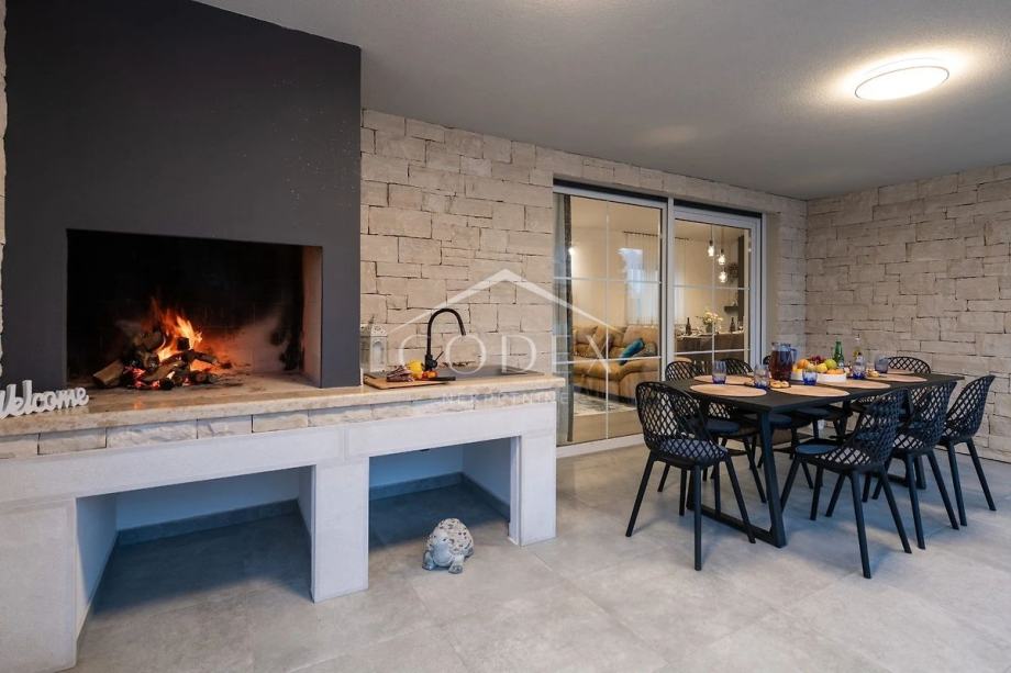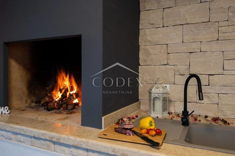 S terase se pruža izlaz prema vanjskom dijelu, gdje se nalazi bazen sa sunčalištem, a tu je i dodatni prostor za druženje, kamin i stepenice koje povezuju unutrašnjost s vanjskim sadržajem.