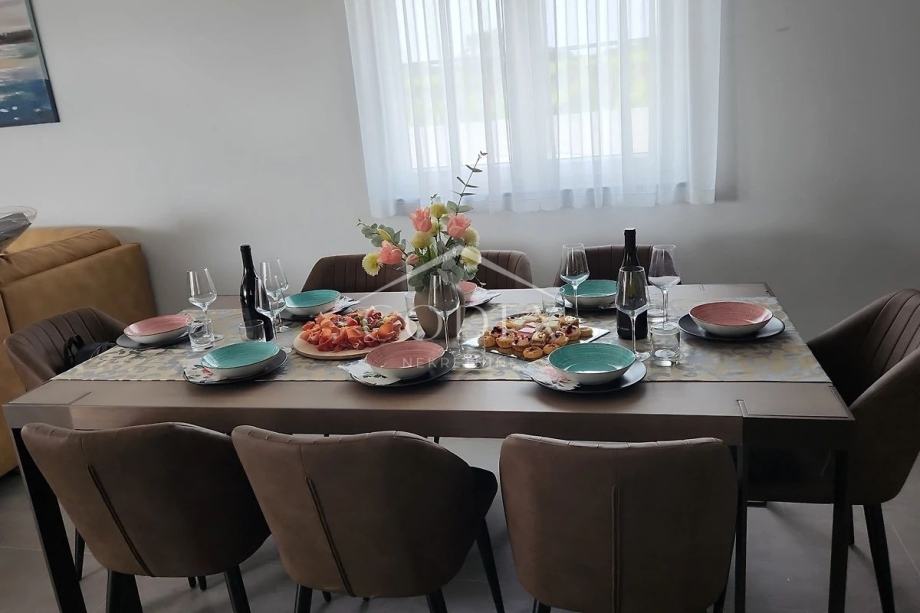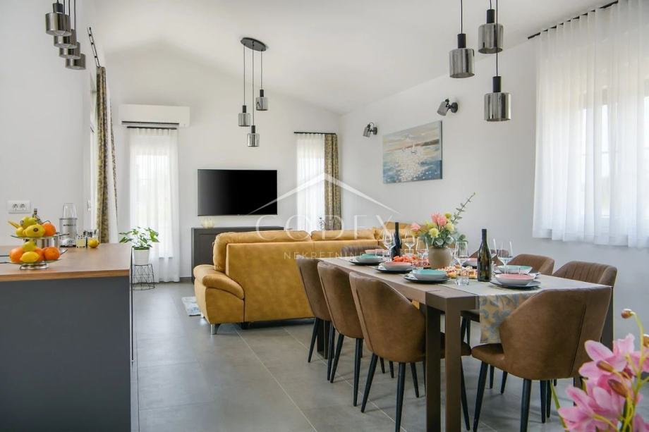 Dnevni prostor oduševljava prostranošću i dizajnom. Kuhinja po mjeri opremljena je vrhunskim uređajima, uključujući ugradbeni frižider, pećnicu, perilicu posuđa i mikrovalnu. Blagovaonica može ugostiti osam osoba a dnevni boravak pruža ugodan prostor za odmor.