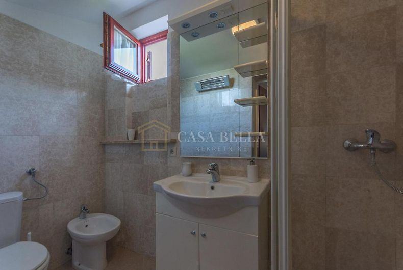 Okućnicu definitivno oplemenjuje impresivni,prelivni bazen veličine 50 m2 sa slanom vodom. Bazen je potpuno automatiziran, ima grijanje i protustrujno plivanje .Tu su još i vanjski tuš i gostinjski toalet .