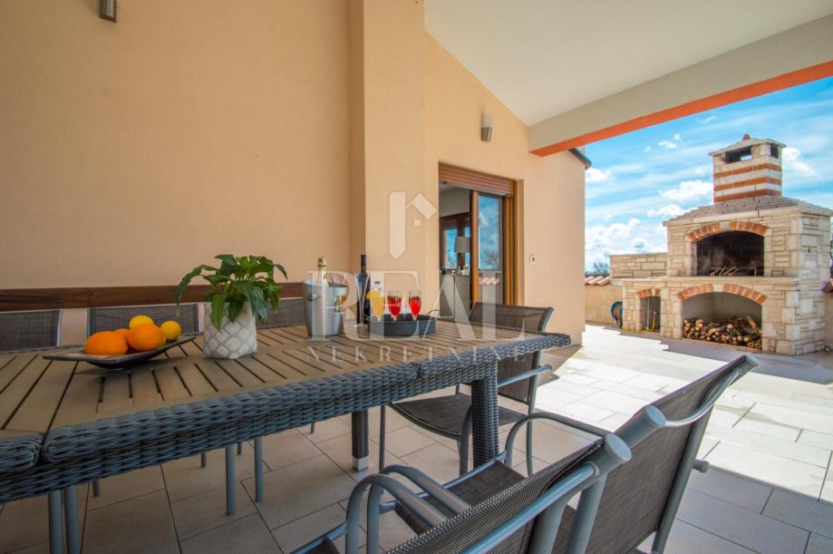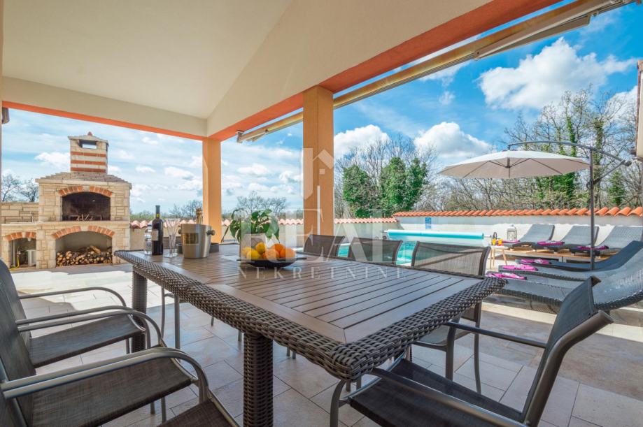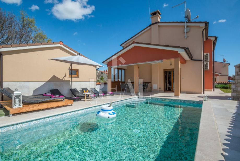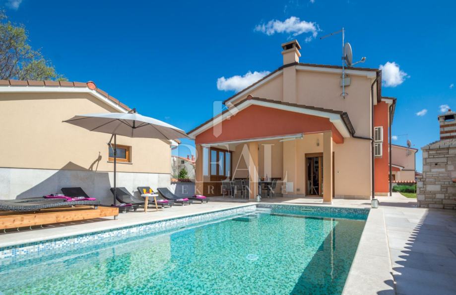 Marčana okolica Villa na mirnoj lokaciji u slijepoj ulici ,blizini javnog prijevoza,vrtića,dućana i škole.Objekt se sastoji od prizemlja i kata ukupne stambene površine 160m2,sa okućnicom od 400m2 na kojoj je grijani bazena od 30m2.