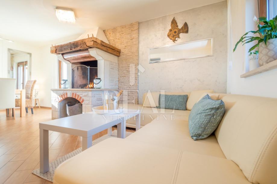 U prizemlju ville je smješten dnevni dio sa kuhinjom, i blagavaonicom te kupaonicom dok su na katu četri spavaće sobe ,kupaonica i terasa od 5m2.Klima uredaji su inverterski grijanje-hladenje i ima ih ukupno 5,jedan u dnevnom dijelu i svaka spavaća soba ima svoj.Kroz čitavi objekt je podno grijanje na struju i veliki kamin na drva u dnevnom dijelu.Vani su osigurana tri parkirna mjesta ,dva vanjska i jedno u garaži koju netko ako želi može prenamjeniti u konobu.