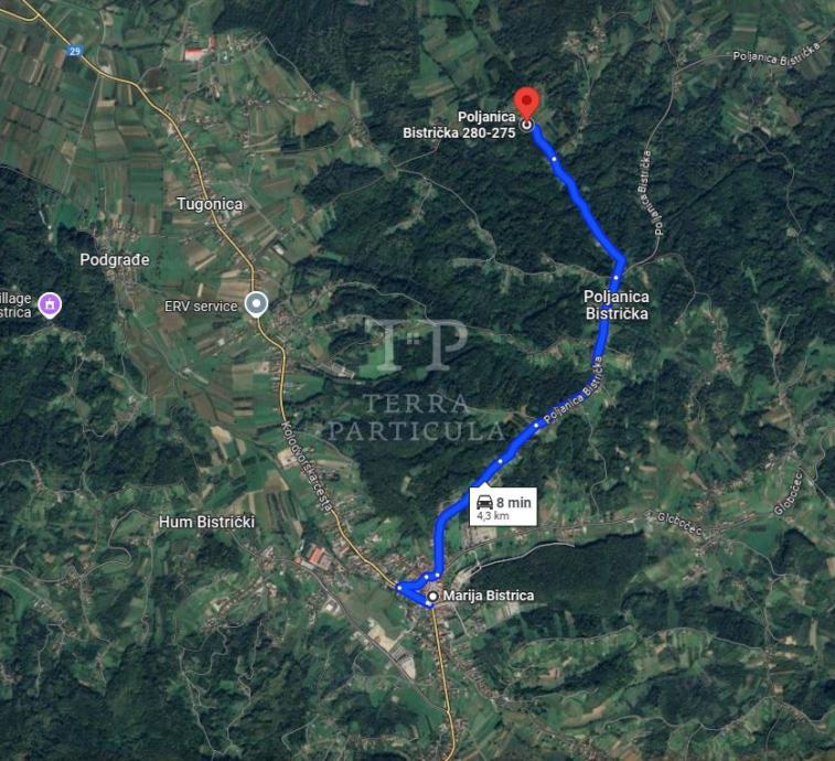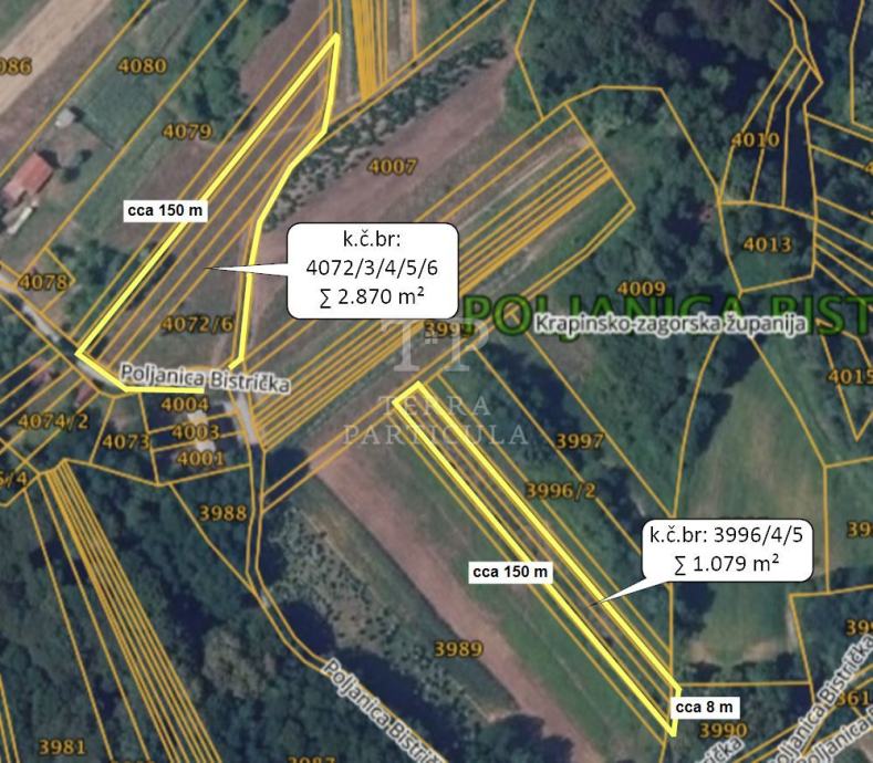 Na prodaju nudimo zemljište površine 3.949 m² od kojeg je cca je 2.870 m² u građevinskoj zoni. Nalazi se nasuprot kuće na adresi Poljanica Bistrička 282. Marija Bistrica, cca 4,5 km udaljeno od centra Marije Bistrice. Vlasništvo zemljišta je čisto, bez tereta.