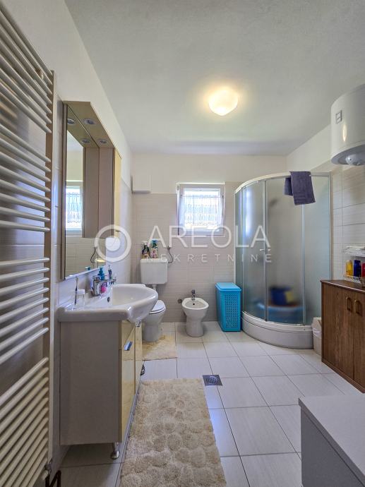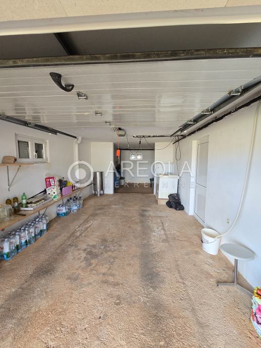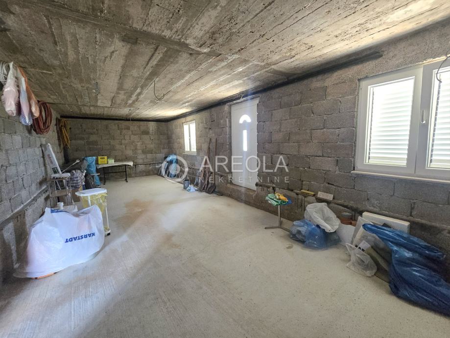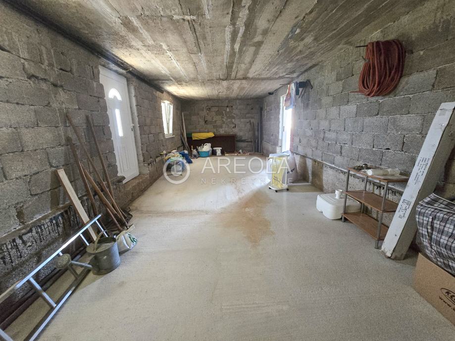 Prizemlje kuće podijeljeno je u dva dijela – jedan dio čini garaža s pripadajućim pomoćnim prostorijama, dok drugi, površine 44 m², predstavlja nezavršeni prostor koji se može prenamijeniti u dodatnu stambenu jedinicu ili apartman, čime se otvara dodatna vrijednost nekretnine.