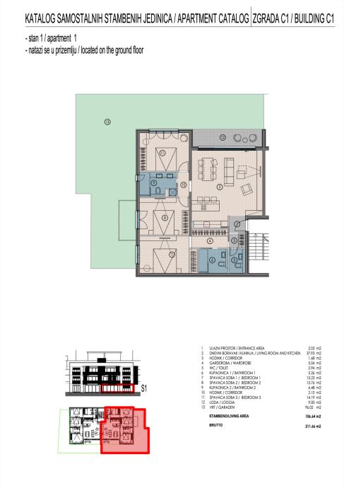 Stan S1 (prizemlje): 106.64 m2 unutrašnji prostor, 9 m2 lođa, 96.02 m2 vrtni prostor, koji skupa s parkirnim mjestom pruža 137.39 m2 neto stambene površine. Cijena je €432.778 s kaparom od 60%, odnosno €480.865 s kaparom od 10%.