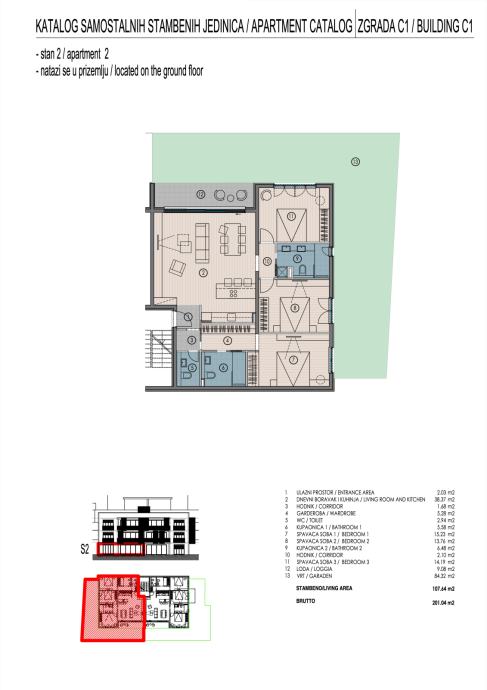 Stan S2 (prizemlje): 107.64 m2 unutrašnji prostor, 9.08 m2 lođa, 84.32 m2 vrtni prostor, koji skupa s parkirnim mjestom pruža 135.53 m2 neto stambene površine. Cijena je €426.919 s kaparom od 60%, odnosno €474.355 s kaparom od 10%.