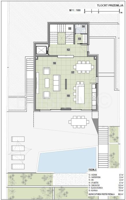 Građevna čestica se nalazi u izgrađenom građevinskom području, mješovita namjena (pretežno stambena). Namjena buduće građevine je obiteljska stambena kuća, katnosti E=P+2.Osim građevine osnovne namjene na čestici su i dvije pomoćne građevine:- garaža- vanjski otvoreni bazen s ukopanim pripadajućim tehničkim prostorima – strojarnica,kompenzacijski i neutralizacijski bazenPomoćne građevine su konstrukcijski dilatirane kako međusobno tako i od građevine osnovne namjene.Svaka građevina je samostojeća.Prizemna etaža stambene kuće se sastoji od ulaznog prostora s pripadajućom garderobom i WC-om, vertikalnih komunikacija, te dnevnog boravka, kuhinje i blagovaonice. Iz svih dnevnih prostora omogućen je kontakt s vanjskim prostorom preko ostakljenih stijena. Na otvorenom prostoru prizemne etaže, planiran je vanjski, otvoreni bazen poligonalnog tlocrta, maksimalnih dimenzija 840 x 370 cm.Komunikacija s gornjim katovima ostvarena je unutarnjim stubištem i dizalom.Na 1. katu kuće nalaze se gospodarska prostorija, te dvije spavaće sobe s pripadajućim sanitarijama i garderobnim ormarima, obje imaju pristup jugozapadnom balkonu.Na 2. katu kuće nalaze se terasa na sjeveroistoku, te dvije spavaće sobe s pripadajućim sanitarijama i garderobnim ormarima, obje imaju pristup jugozapadnom balkonu.