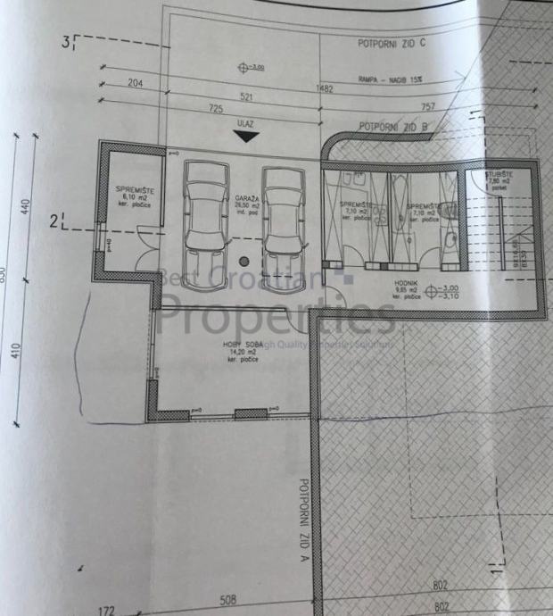 1. ETAŽA: ukupna površina 102,40 m2; sastoji se od ulaznog prostora, dnevnog boravaka s izlazom na vrt, kuhinje, blagovaonice, kupaonice, dva spremišta i kotlovnice.