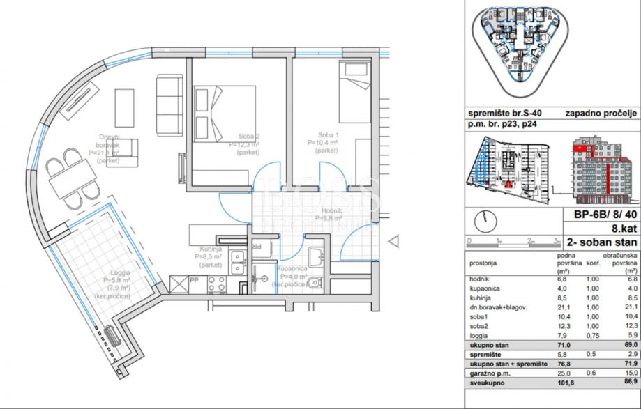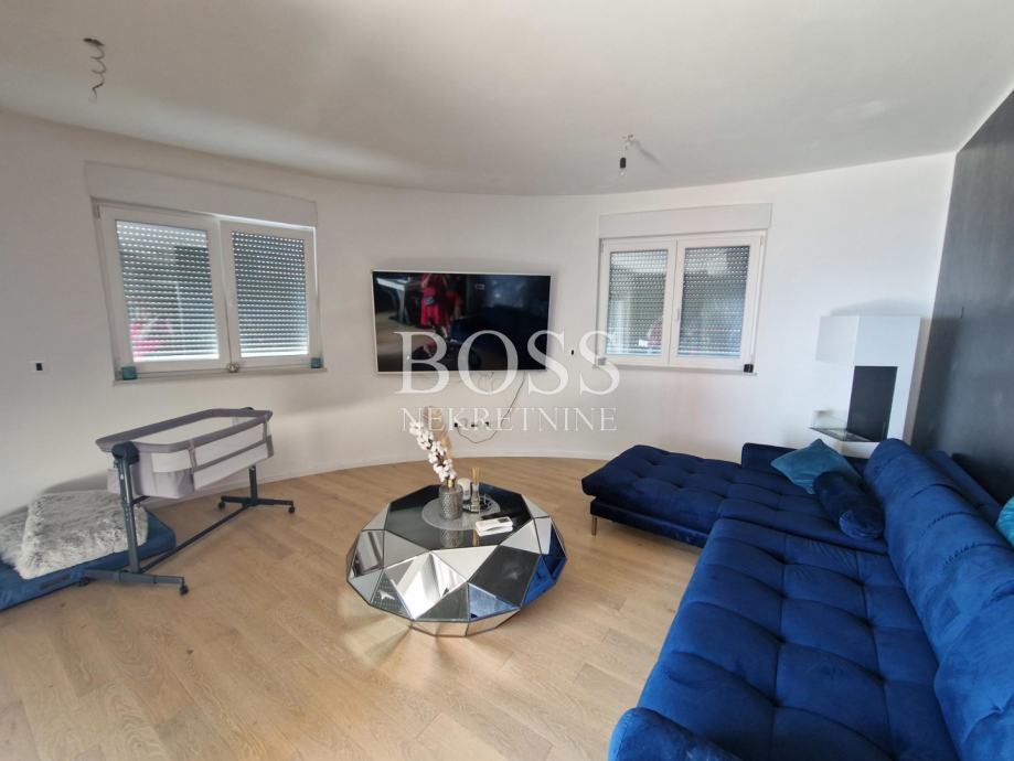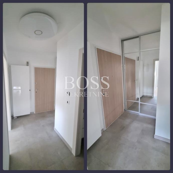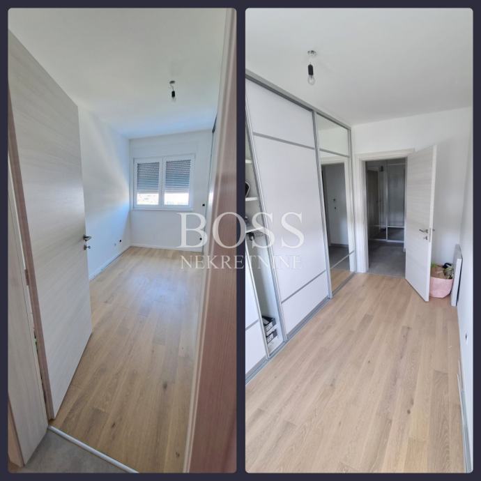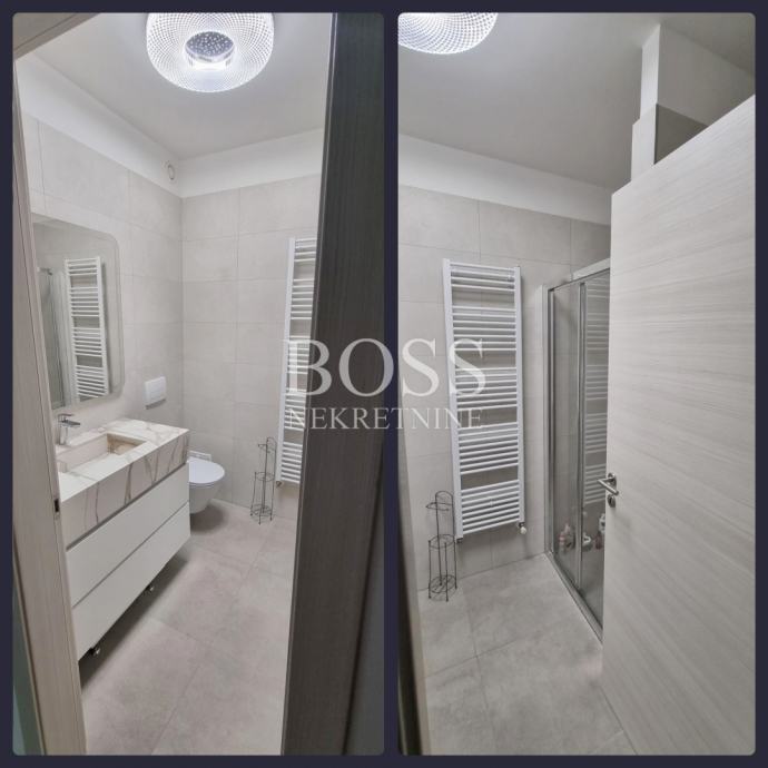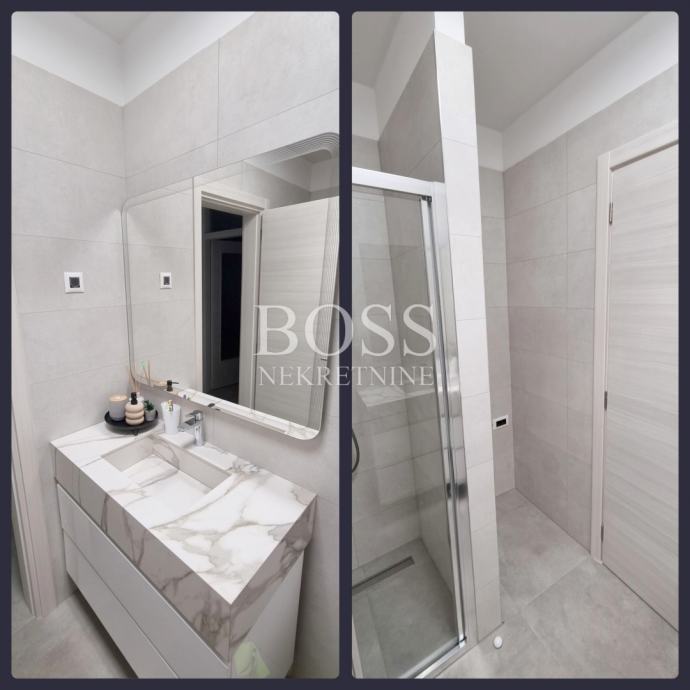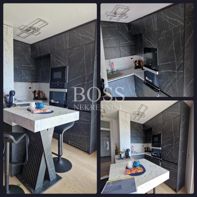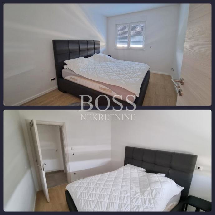 Martinkovac, u ponudi imamo stan u novogradnji površine 76.80m2, moderno uređen s predivnim pogledom. Sastoji se od kuhinje s blagovaonom i dnevnog boravka, dvije spavaće sobe, kupaone, hodnika, lođe i ostave. Manja soba je uređena kao walk-in ormar uz mogućnost da se staviti manji krevet 90x200 ili radni stol. Dominantna sjeverozapadna orijentacija osigurava puno sunca u dnevnom boravku za vrijeme popodnevnih sati iz kojeg se izlazi na lođu s otvorenim pogledom na more. Grijanje tople vode se vrši u kotlovnici, te u stanu putem električnih bojlera. Iz kotlovnice dolazi topla voda za kupaonu i kuhinju, te podno grijanje koje je u cijelom stanu, a svaka prostorija ima svoj termostat, u dnevnom boravku je ugrađen klima uređaj. Zgrada je opremljena video parlafonom, a ugrađen je video nadzor, te sustav vatrodojave. U cijenu je uključen kompletan namještaj, te svi kućanski aparati. Stanu pripadaju dva garažna parkirna mjesta ukupne površine 25m2. Boss, kontakt: 091/379-1010 Dragan