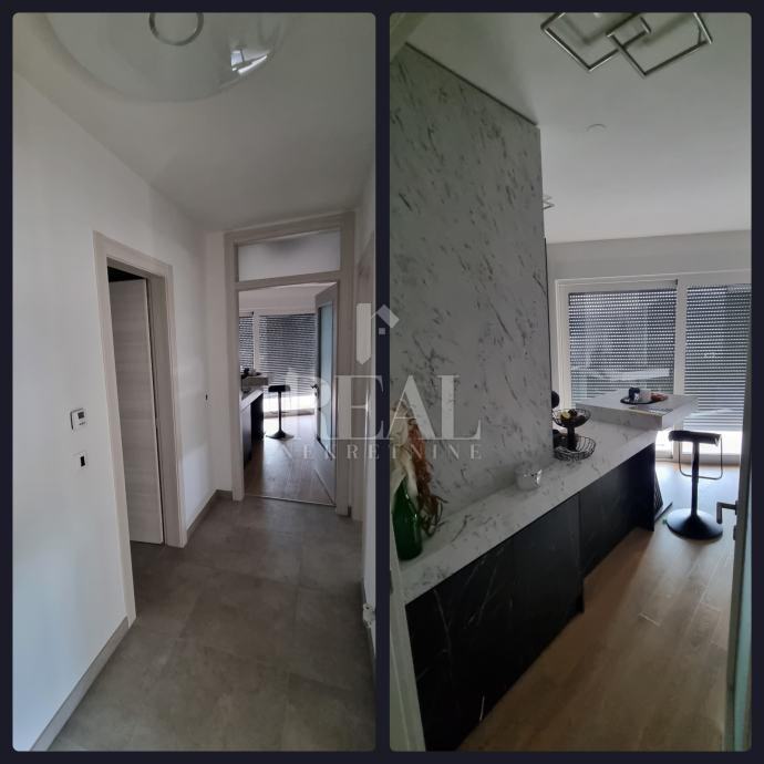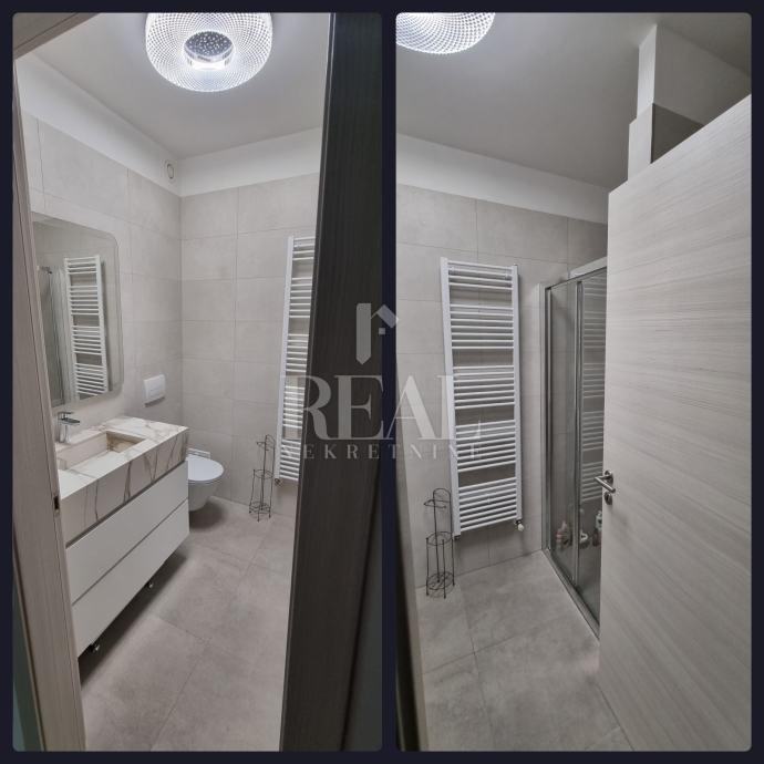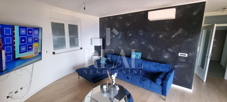Novi stan u novogradnji moderno uređen površine 76,80m2 koji se sastoji od kuhinje s blagovaonicom i dnevnog boravka, dvije spavaće sobe, kupaonice, hodnika, lođe i ostave. Sa lođe se pruža prekrasan panoramski pogled na Opatiju, Riječki zaljev i otoke, te brdovito zaleđe. Nekretnina je potpuno namještena i kao takva se i prodaje. Zgrada u kojoj se nalazi stan ima centralno podno grijanje i topla voda iz zajedničke kotlovnice. Termostat ima svaka prostorija. Stanu pripadaju dva parkirna mjesta u garaži.