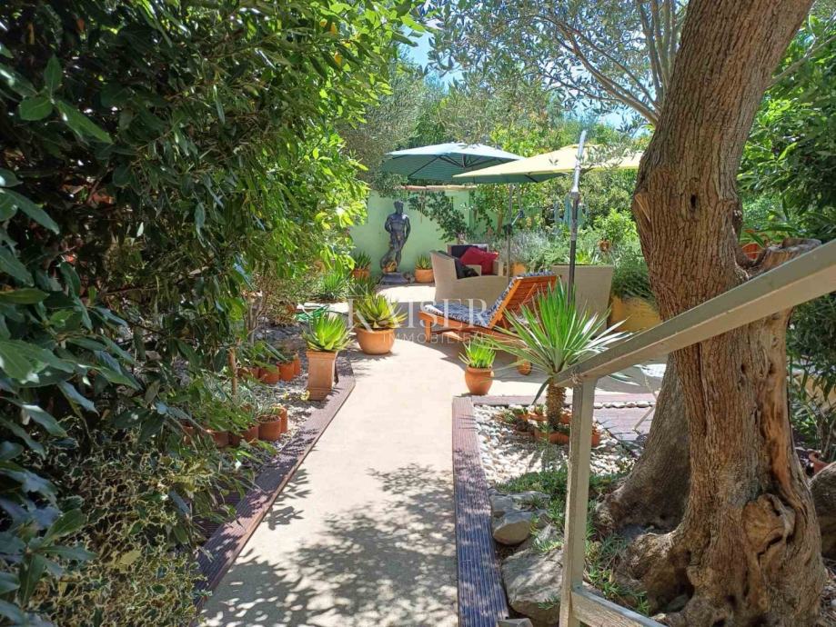 Kuća je dio dvostrukog objekta s vlastitim ulazom a udaljenost od prekrasne plaže je cca 20 metara. Kuća ima tri terase na različitim razinama, na kojima se nalaze autohtone zelene mediteranske biljke, veći broj stabala lovora i maslina, te visoke gredice za uzgoj povrća. Kuća ima stambenu površinu od 90 m2, zimski vrt od 21 m2, podrum od 16 m2 te okućnicu od 280 m2.