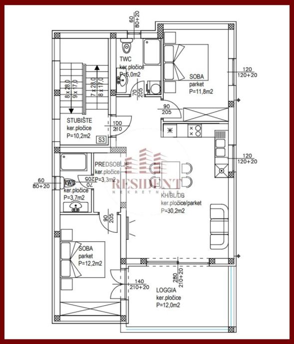 - 2 spavaće sobe (11,80 m2 + 12,20 m2)