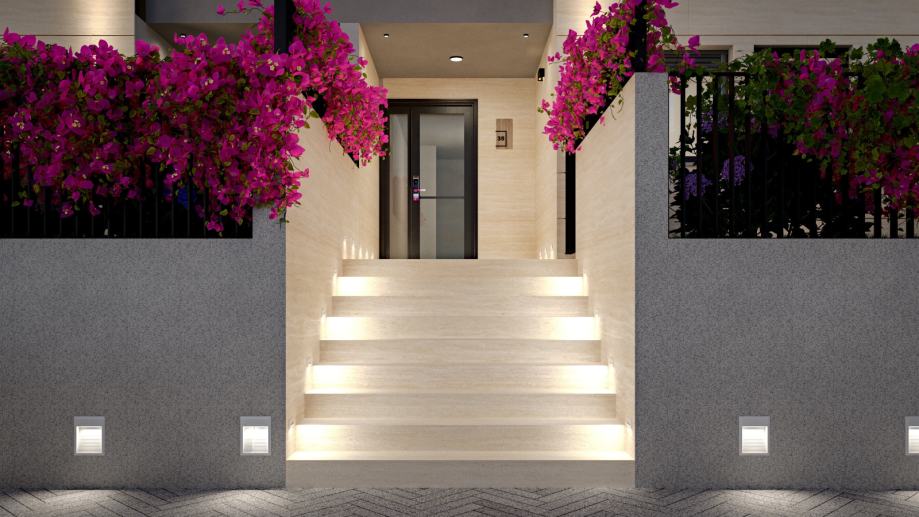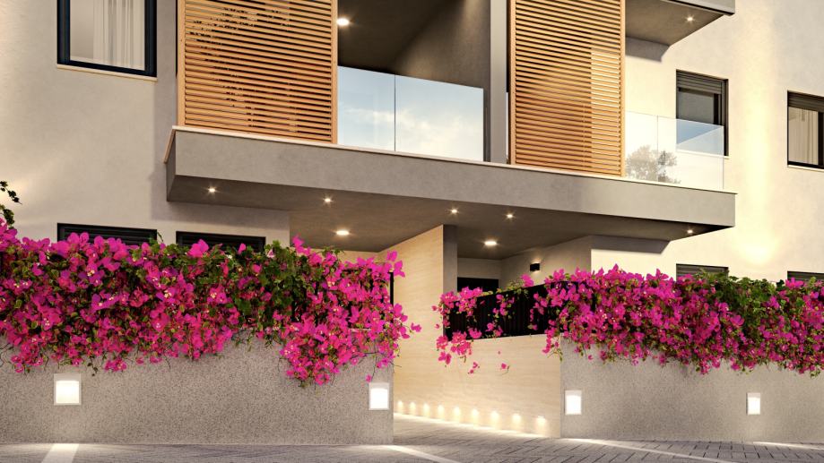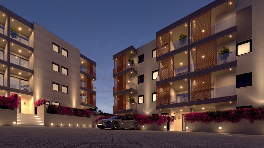 Eksterijer je oblikovan u kombinaciji travertin fasade, prozirnih staklenih ograda, aluminijskih kliznih roleta i crnih otvora, stvarajući profinjen i moderan vizualni identitet. Uređeni pristupi, hortikultura, ambijentalna LED rasvjeta i vanjski video nadzor osiguravaju visoku razinu estetike i sigurnosti. Stanovi su projektirani s naglaskom na funkcionalne tlocrte, odlično prirodno osvjetljenje i izbor premium materijala.