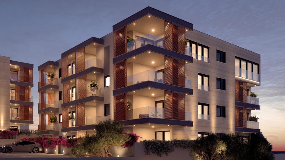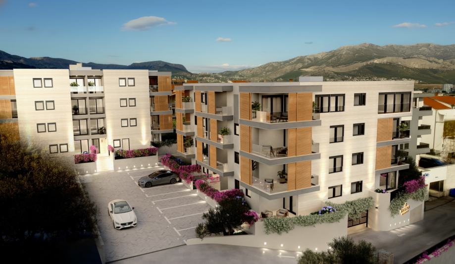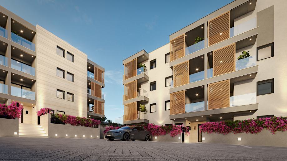 Eksterijer je oblikovan u kombinaciji travertin fasade, prozirnih staklenih ograda, aluminijskih kliznih roleta i crnih otvora, stvarajući profinjen i moderan vizualni identitet. Uređeni pristupi, hortikultura, ambijentalna LED rasvjeta i vanjski video nadzor osiguravaju visoku razinu estetike i sigurnosti. Stanovi su projektirani s naglaskom na funkcionalne tlocrte, odlično prirodno osvjetljenje i izbor premium materijala.