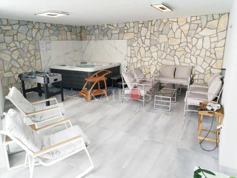 Blagavaonica i kuhinja su poptuno opremljenje, uključujući i veliki hladnjak i perilicu suđa. Izlaz iz dnevnog boravka na zatvorenu terasu/wellness prostor koja ima vlastiti klima uređaj, sa garniturom za sjedenje, jacuzzi kadom za 6 osoba i stolnim nogometom te izlazak na vanjski bazen.