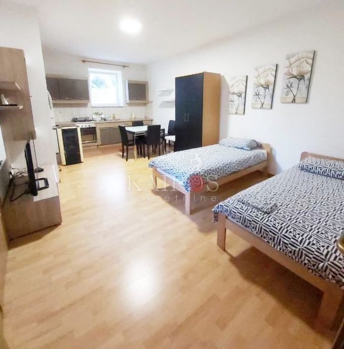 MATULJI, Mihotići, iznajmljujemo stan površine 80 m2, kompletno namješten, dvosoban s dnevnim boravkom i terasom. Stan se iznajmljuje firmama za njihove radnike (6 osoba). Grijanje na peć na pelete.