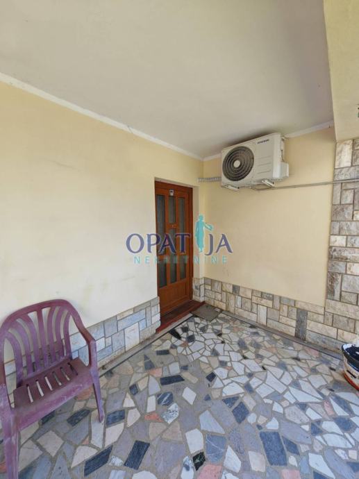 U prizemlju i na katu su dva identična stana od 100 m2, a sastoje se od hodnika, dvije spavaće sobe, kuhinje s dnevnim boravkom, kupaone i WC-a. Svaki stan ima balkon s panoramskim i otvorenim pogledom na cijeli Kvarner. Na velikoj okućnici ima mjesta za parking i još se nalaze i dvije garaže.