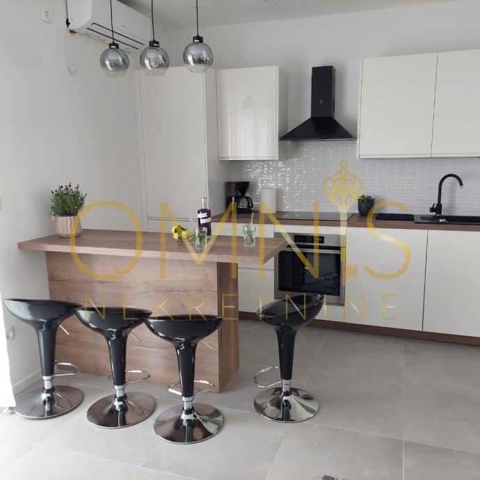 Donja etaža sastoji se od elegantno uređenog dnevnog boravka povezanog s kuhinjom i blagovaonicom, koji izlazi na balkon s prekrasnim pogledom na more. Prostor je opremljen suvremenim namještajem, modernim kuhinjskim uređajima i udobnim sjedećim kutkom, stvarajući ugodnu atmosferu za svakodnevni život. Na gornjoj etaži nalaze se dvije spavaće sobe – jedna s bračnim krevetom i ugradbenim ormarima, druga s dva odvojena kreveta, idealna za radni prostor ili gostinjsku sobu. Kupaonica je renovirana, opremljena tuš-kabinom, modernom sanitarnom opremom i perilicom rublja.
