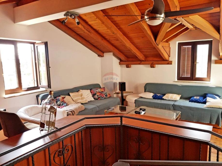 Prizemlje se sastoji od: dnevnog boravka s kuhinjom, blagovaonom i kaminom, spremišta, wc-a i prostrane natkrivene ulazne terase