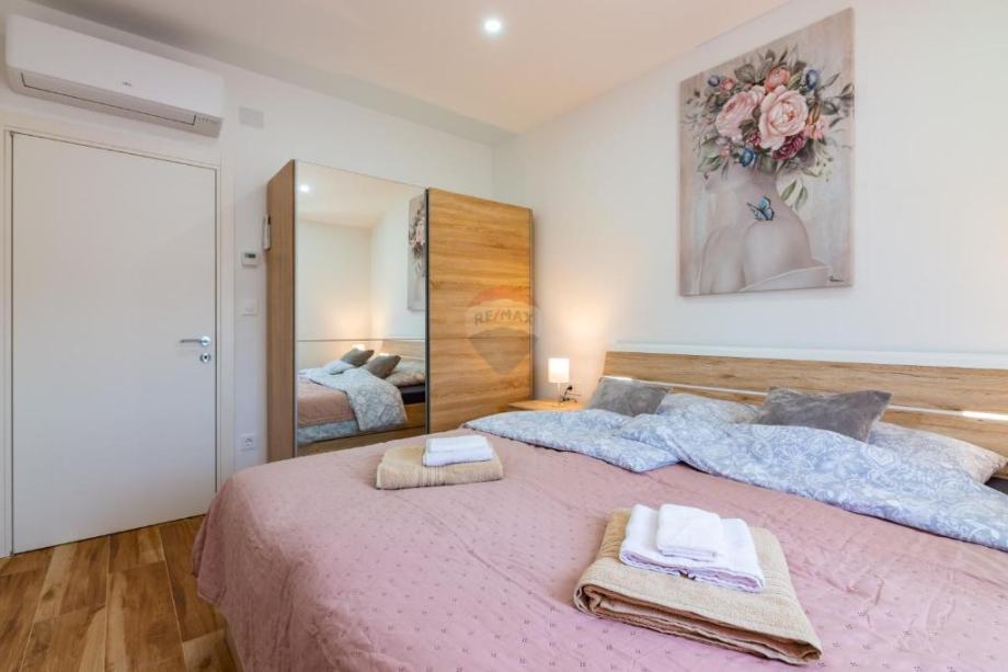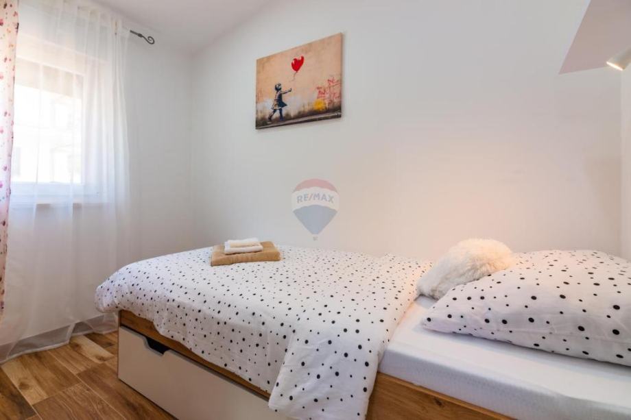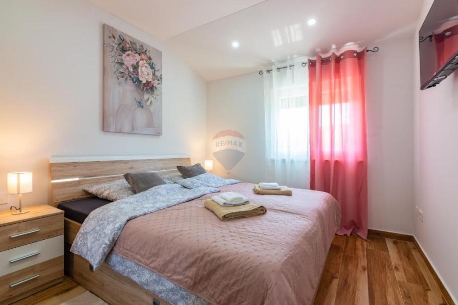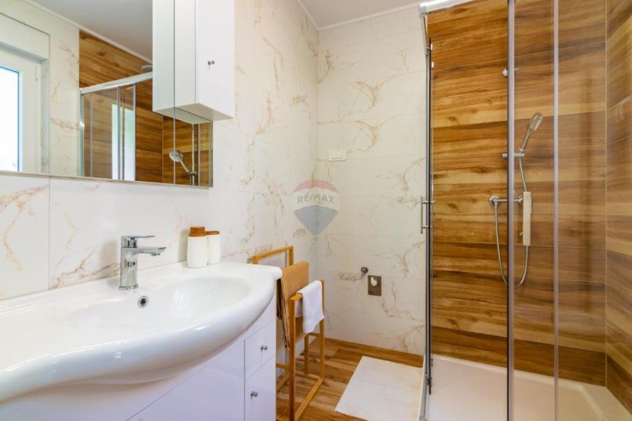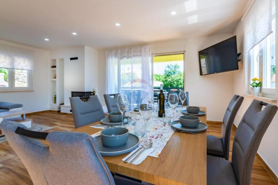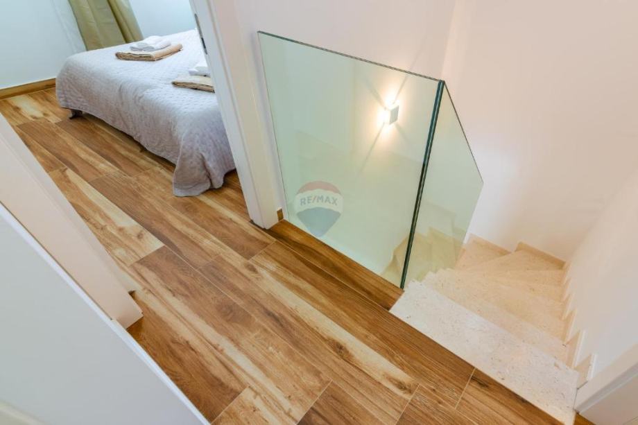 lijepu natkrivenu terasu s pogledom na bazen. Na kat vodi unutarnje stubište gdje imamo tri spavaće sobe s kupaonicom.