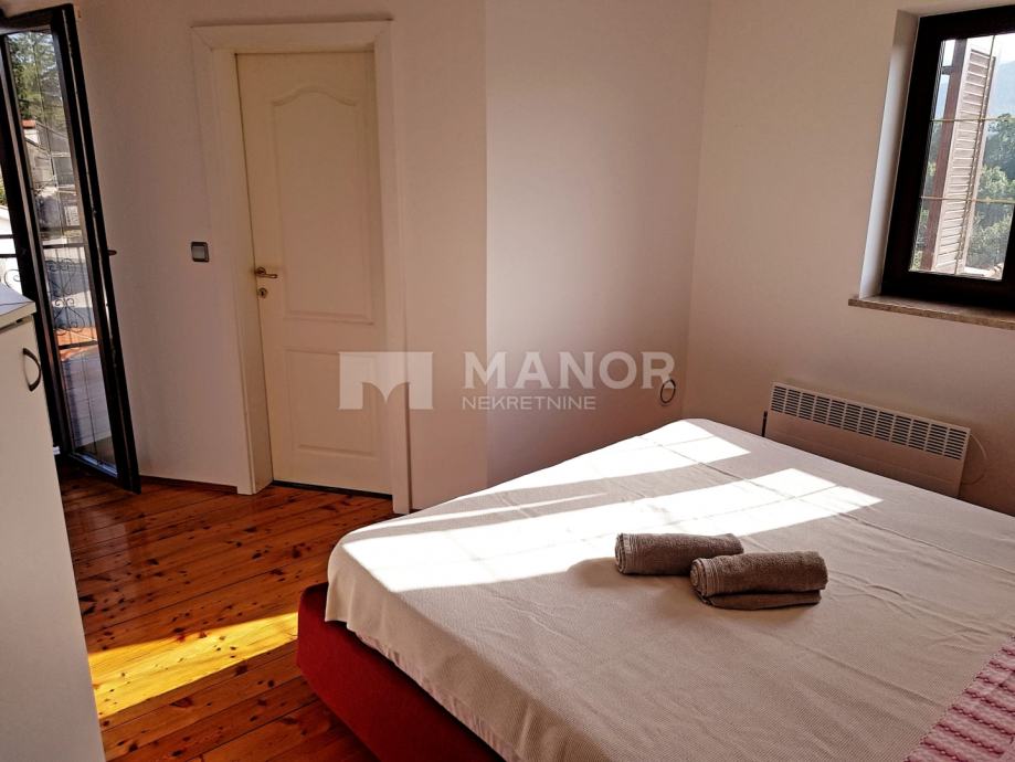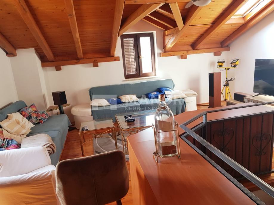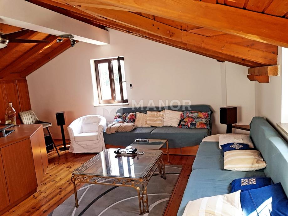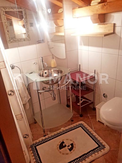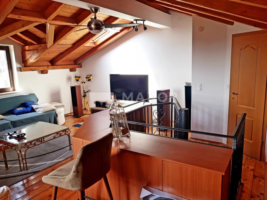 spavaća soba s kupaonicom, balkonom te ugradbenim ormarom. U visokom potkrovlju stajaće