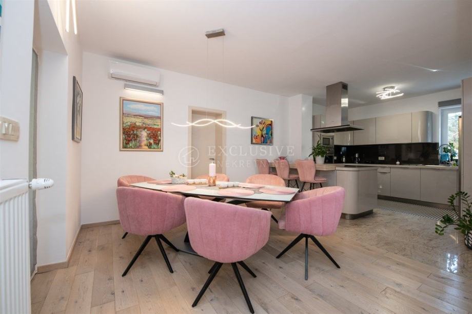 U prizemlju i na 1. katu je jedan dvoetažni stan sa stubištem, wc-om i dvije luksuzne sobe sa luksuznim kupaonicama i pripadajućim terasama, dnevnim boravkom, kuhinjom, blagavaonicom, ostavom, sa pripadajućom terasama sa roštiljem, kaminom, pečenjarom i bazenom.