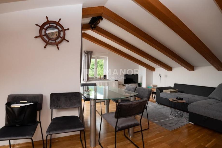 Dvoetažni stan sastoji se od hodnika, kuhinje s blagovaonicom i dnevnim boravkom, dvije master spavaće