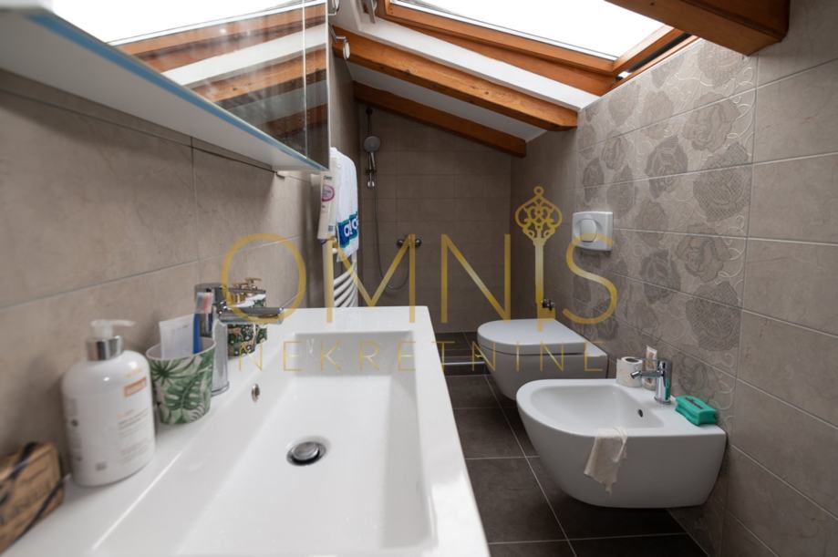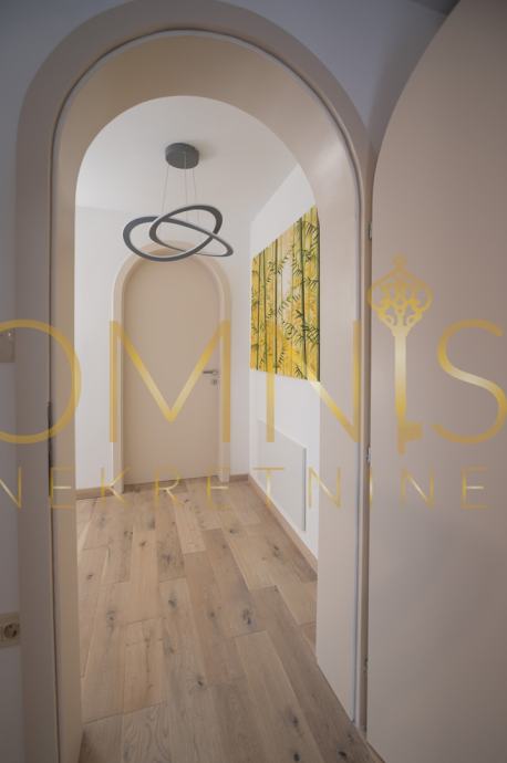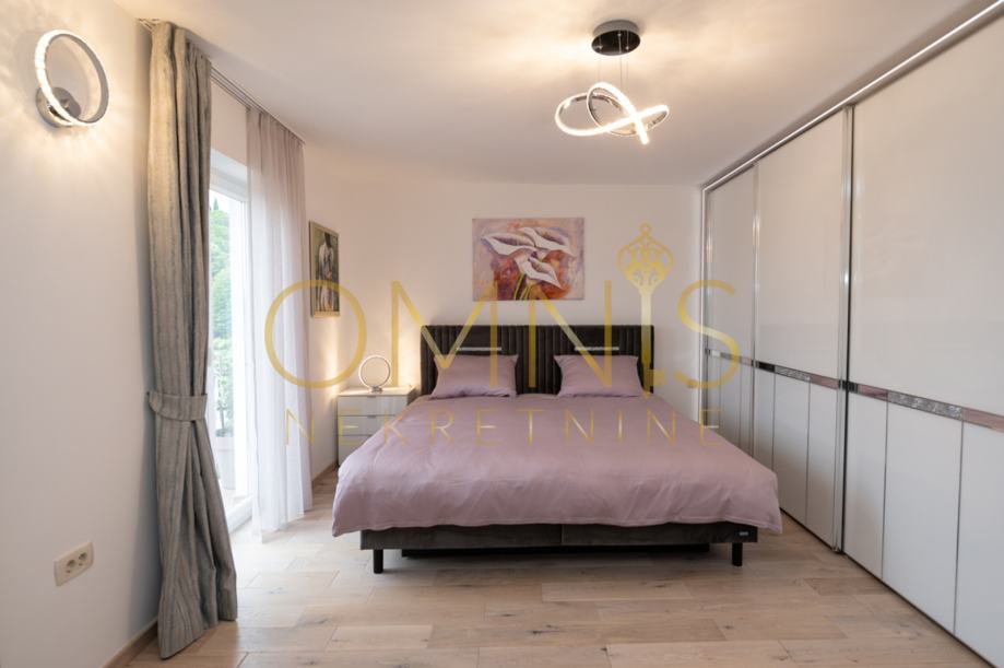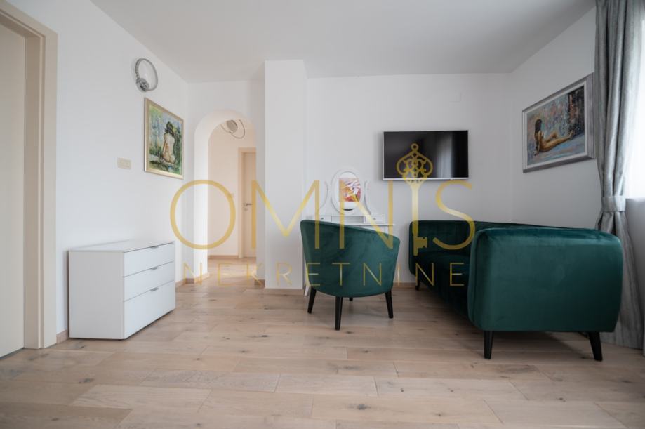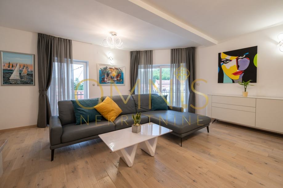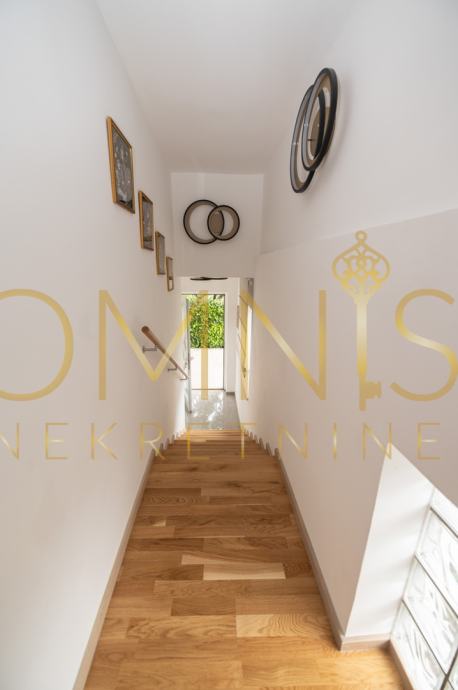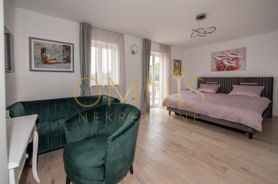 U prizemlju i na 1. katu je jedan dvoetažni stan sa stubištem, wc-om i dvije luksuzne sobe sa luksuznim kupaonicama i pripadajućim terasama, dnevnim boravkom, kuhinjom, blagavaonicom, ostavom, sa pripadajućom terasama sa roštiljem, kaminom, pečenjarom i bazenom.