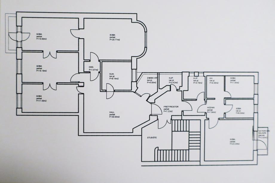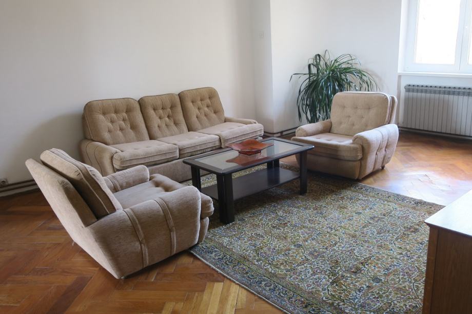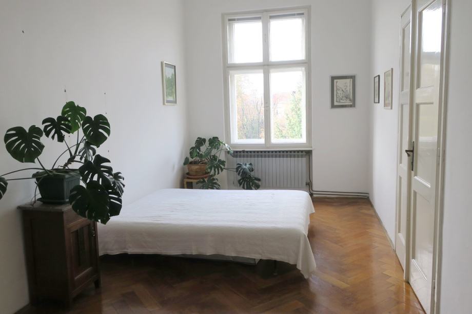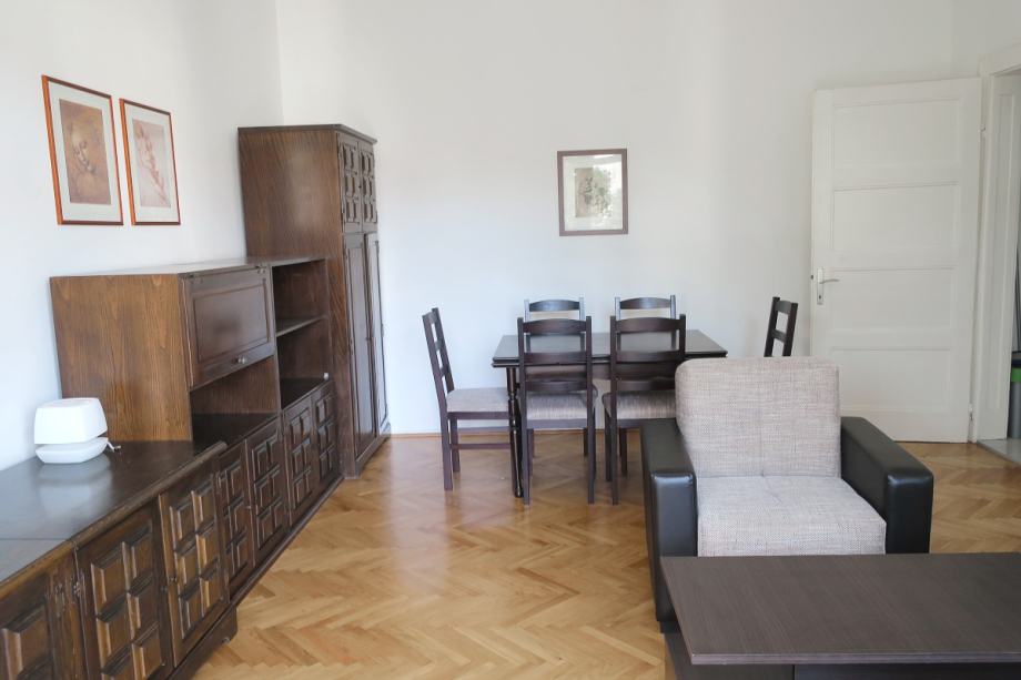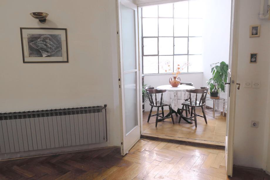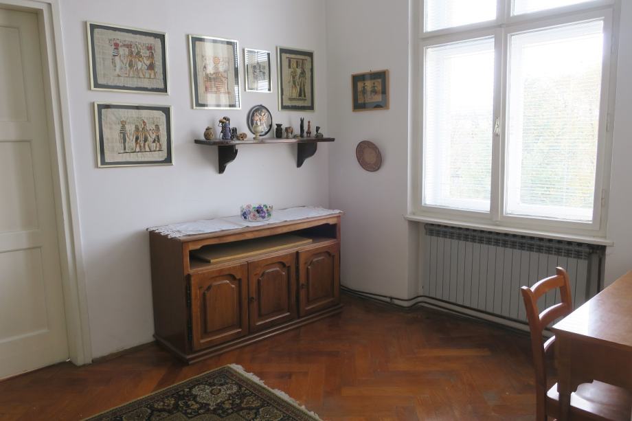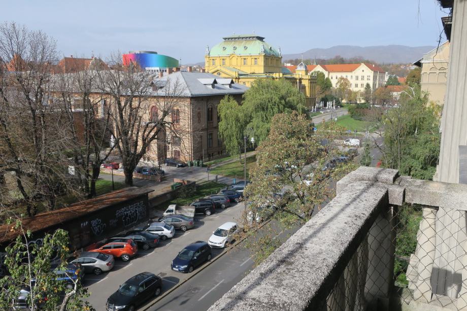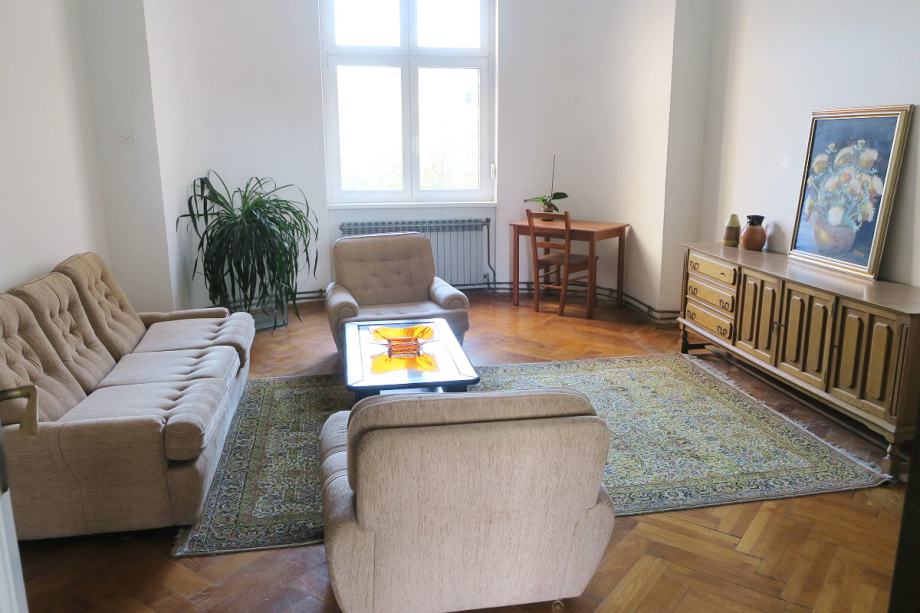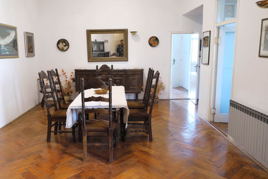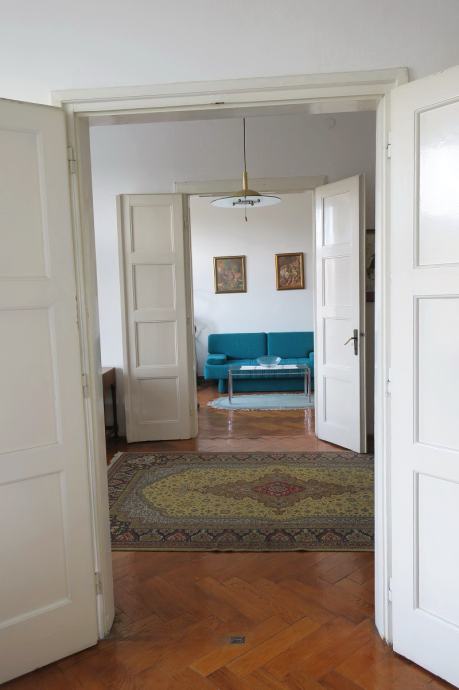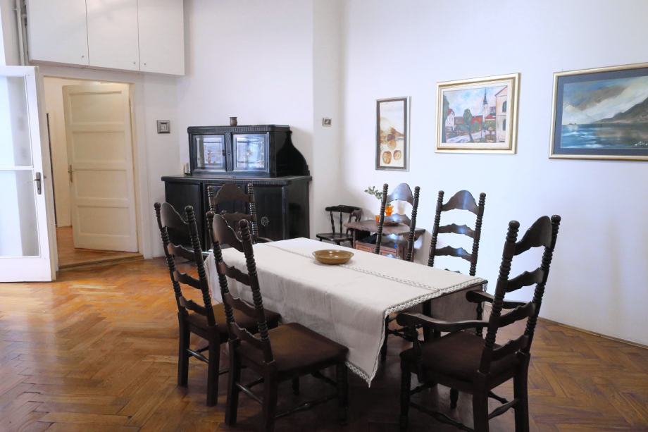 Atraktivan šesterosobni stan na Mažuranićevom trgu, površine 193 m2, na III katu. Visina stropa u stanu je 3.60 m. Podijeljen je na dvije zasebne stambene cjeline i dobro održavan. U zemljišnim knjigama je upisan kao jedan stan površine 166 m2