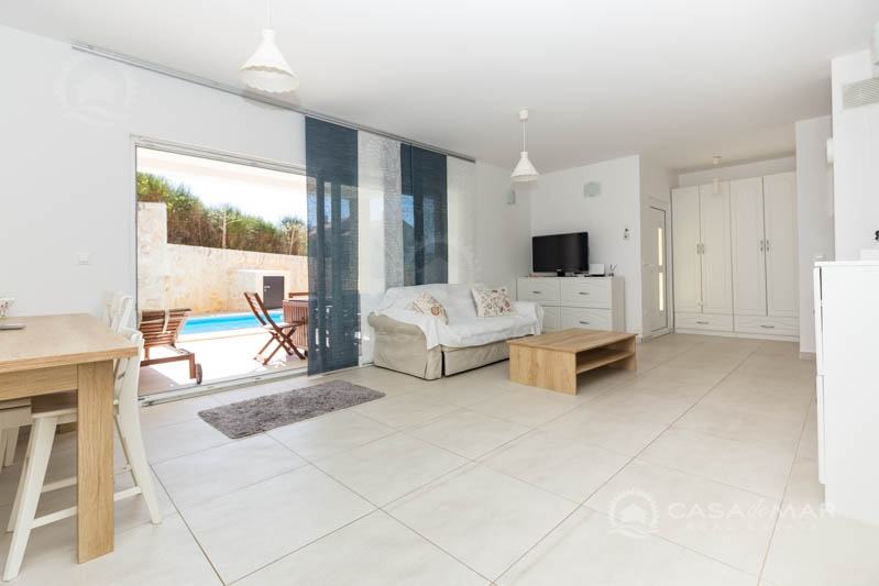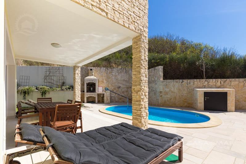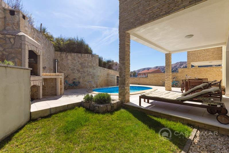 Iz dnevnog boravka izlazi se na prekrasnu natkrivenu terasu i okućnicu površine 120 m2 na kojoj se nalaze grijani bazen, sunčalište, roštilj i solarni tuš.