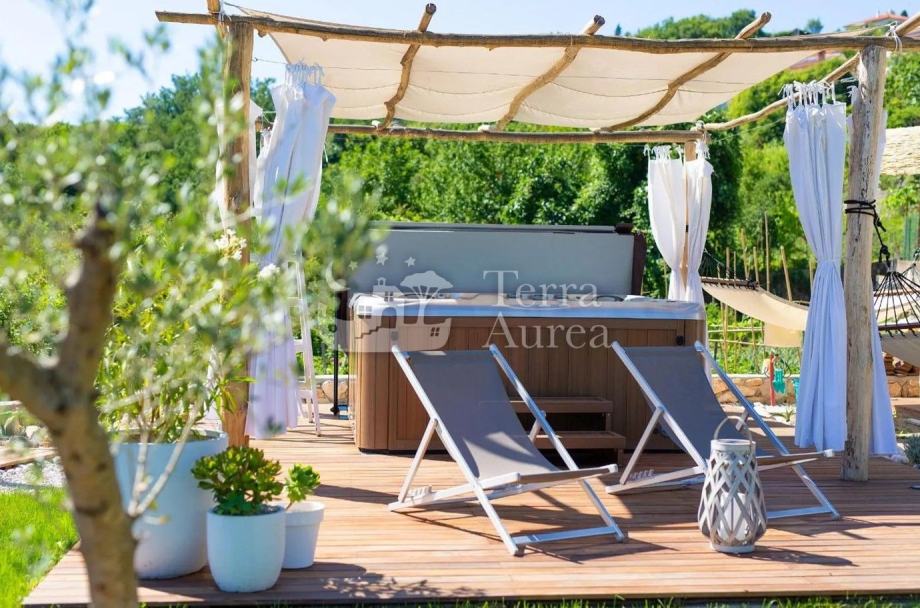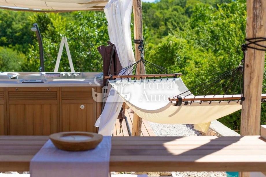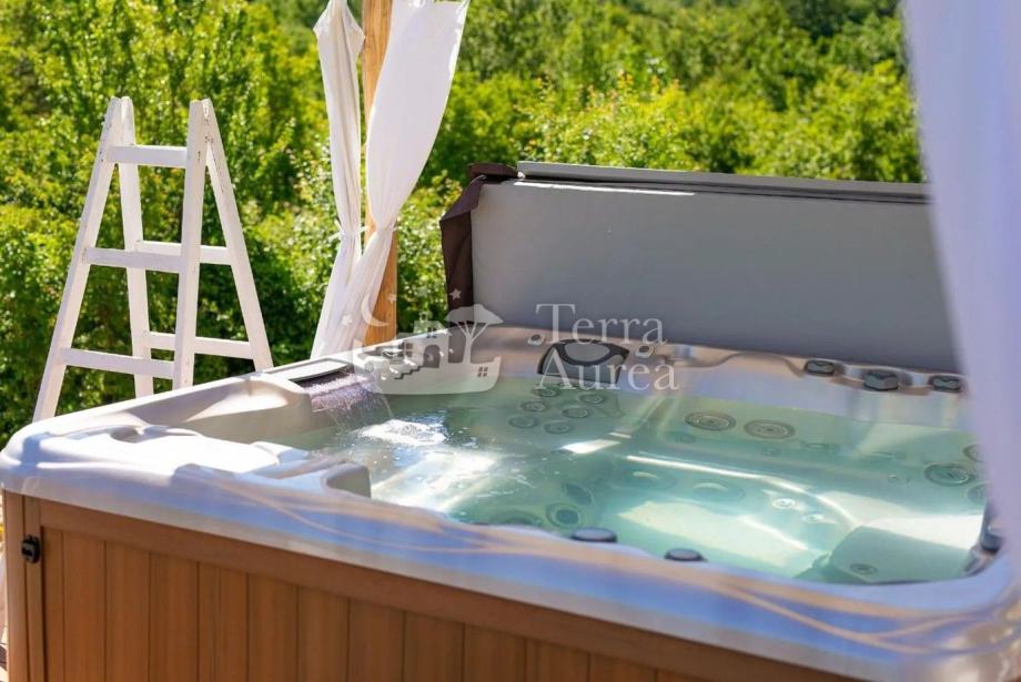 Prostrana okućnica površine 450 m2 dodatno obogaćuje životni prostor. Posebno osmišljena za uživanje u svim godišnjim dobima, pruža sve što je potrebno za opuštanje – od vrta i sunčališta, preko saune i jacuzzija, do natkrivene vanjske kuhinje s roštiljem i prostora za druženje. Dva parkirna mjesta unutar okućnice osiguravaju dodatnu praktičnost.