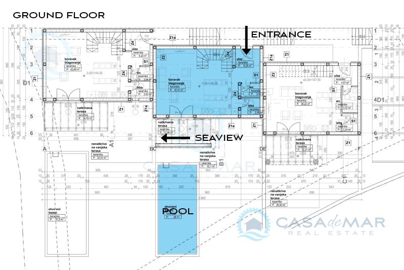 Prizemlje kuće se sastoji od dnevnog boravka sa kuhinjom i blagovaonom. Kod ulaza se nalazi toalet, a kuhinja je dodatno proširena ostavom. Iz dnevnog boravka se izlazi na natkrivenu terasu i okućnicu koja pruža predivan otvoreni pogled na more.