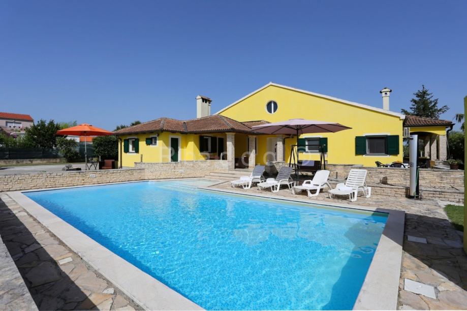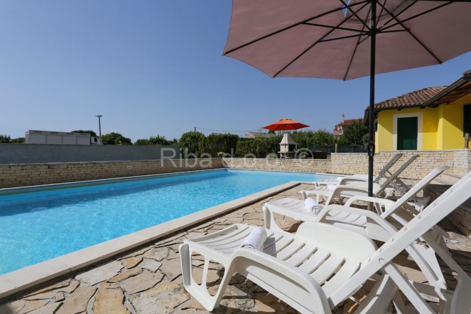 U dvorištu je veliki vanjski bazen, okružen sunčalištem s ležaljkama i suncobranima – savršeno za opuštanje i uživanje u suncu.