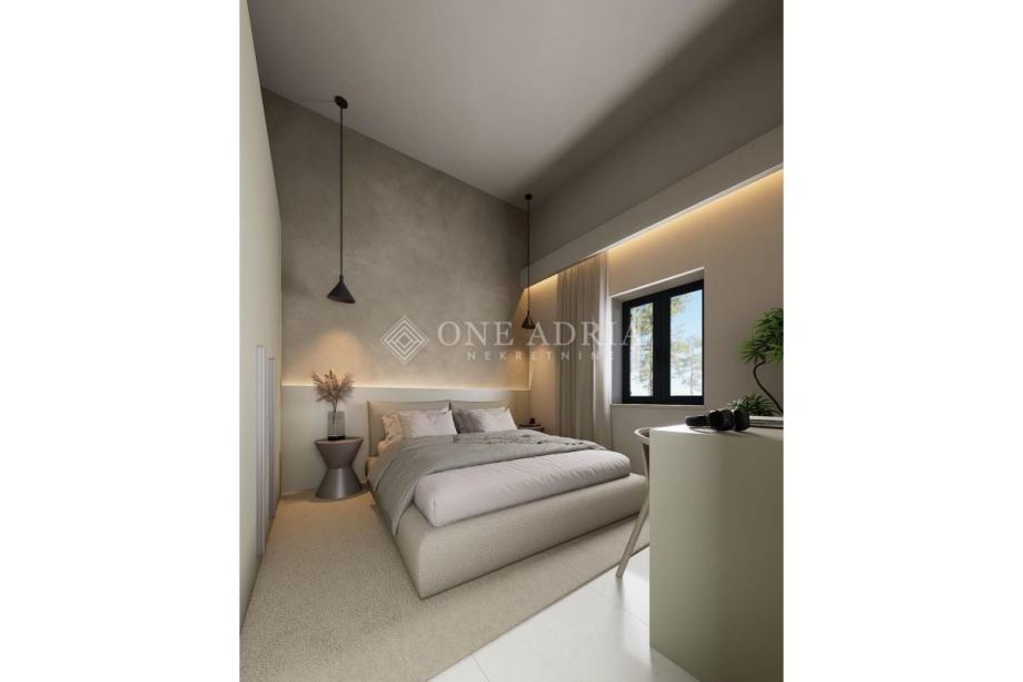 U prizemlju kuće nalazi se ulazni prostor, prostrani dnevni boravak s izlazom na terasu, kuhinja s blagovaonicom otvorenog koncepta, kupaonica i spremište ili tehnička prostorija. Na prvom katu smještene su dvije spavaće sobe i jedno zajedničko kupatilo.