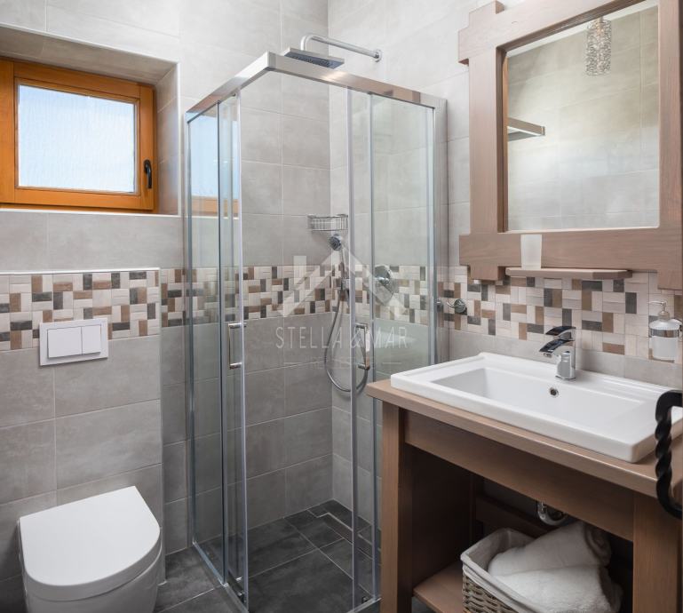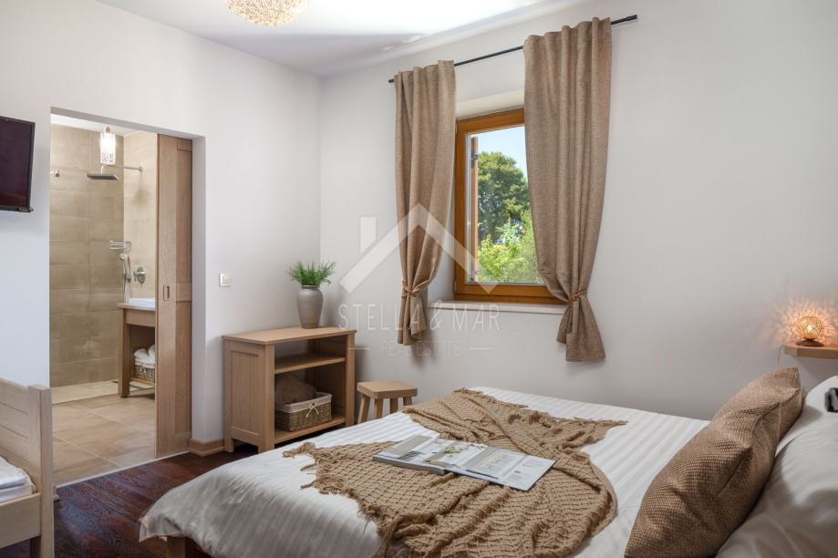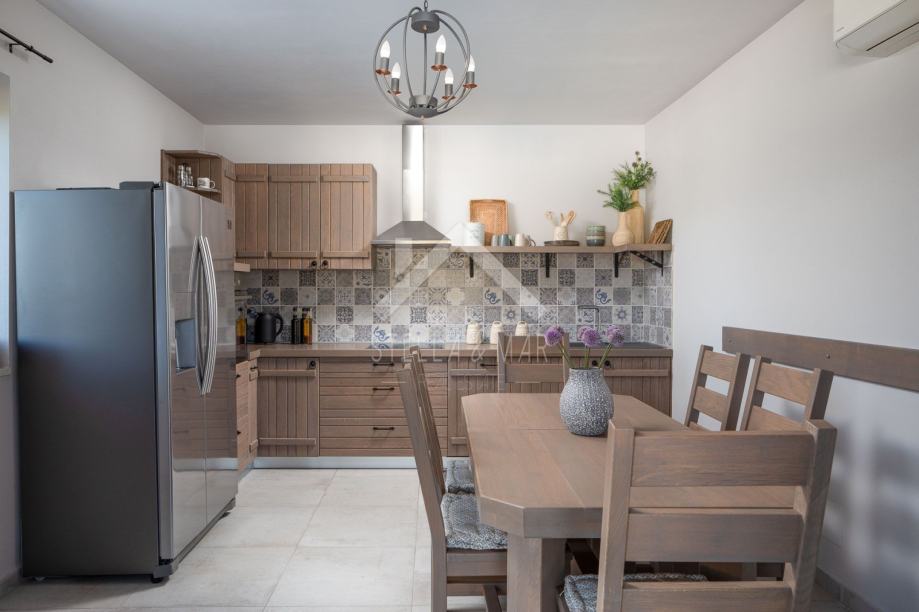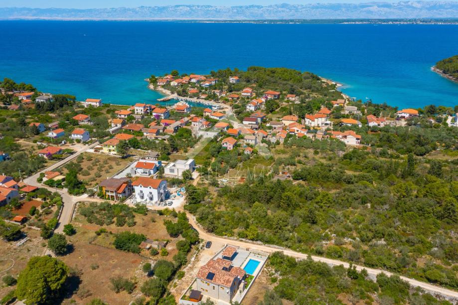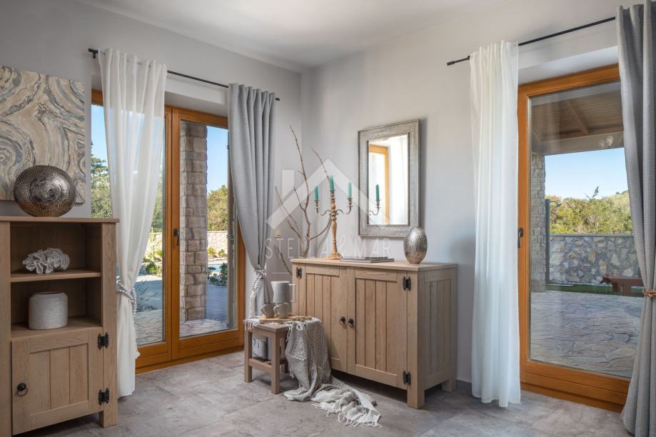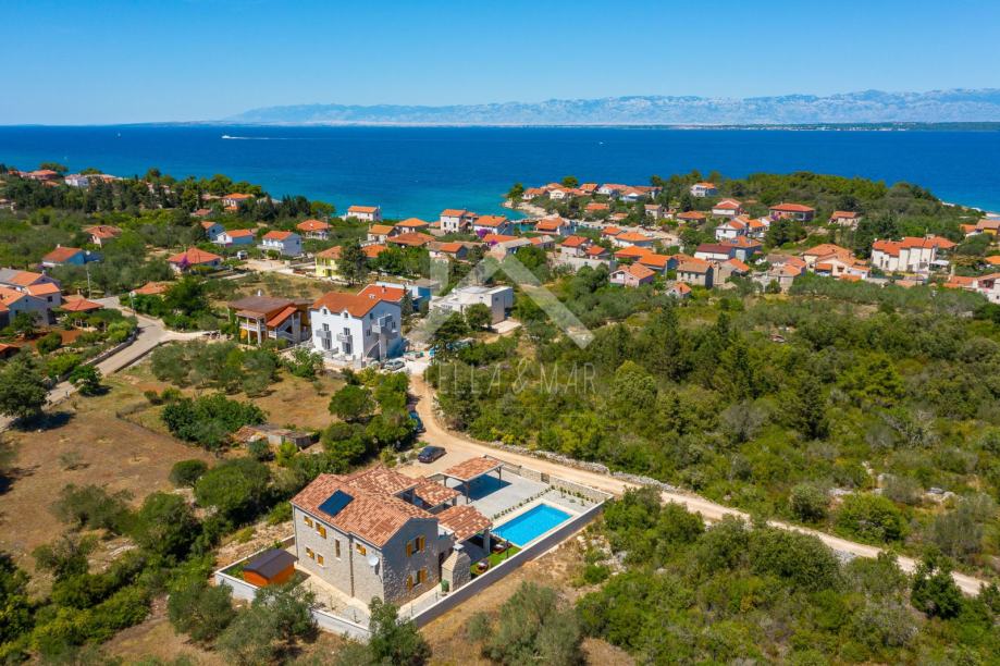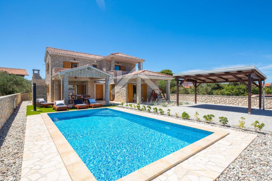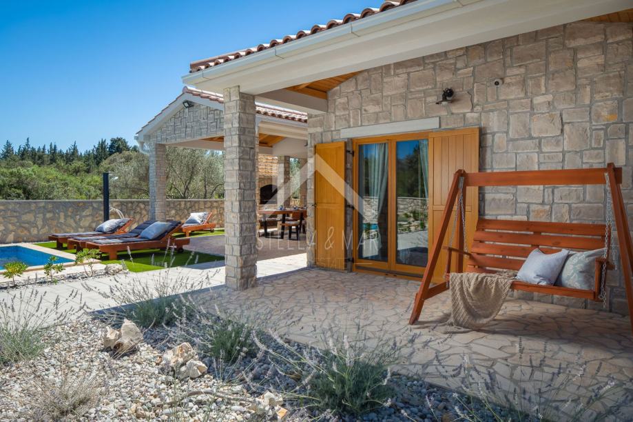 Kamena vila s bazenom luksuzno opremljena, od video nadzora, alarmnog sustava pa do ručno izrađenog namještaja od punog drveta (hrasta) po mjeri i svim aparatima potrebnim za kuću,te finska sauna. Kamena vila udaljena je svega 300 m od mora i plaže, a pruža potpunu intimu boravka, jer nema direktnih susjeda, okružena je mediteranskim raslinjem i maslinama, s pogledom na more i prekrasan okoliš. U dvorištu je uređen vrt s mediteranskim biljem koje se navodnjava vremenskim programiranim upravljačem i vrtna drvena kućica kao spremište. Kuća je izrađena od blok opeke s termo izolacijom od 10 cm, i zidanim prirodnim kamenom debljine 15 cm (NIJE KAMENA OBLOGA), ukupna debljina zida je 55 cm. Prozori, vrata I grilje su također od drveta (hrasta) s troslojnim IZO-staklom, punjen plinom i UV zaštitom.