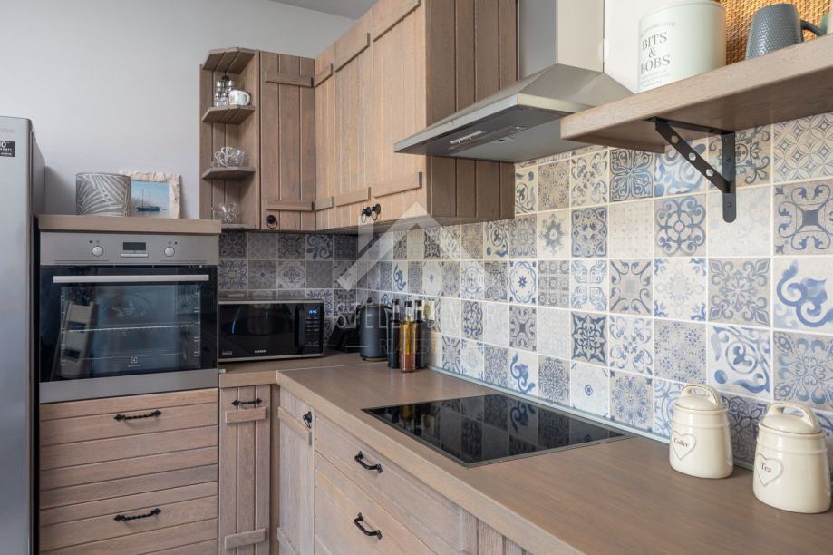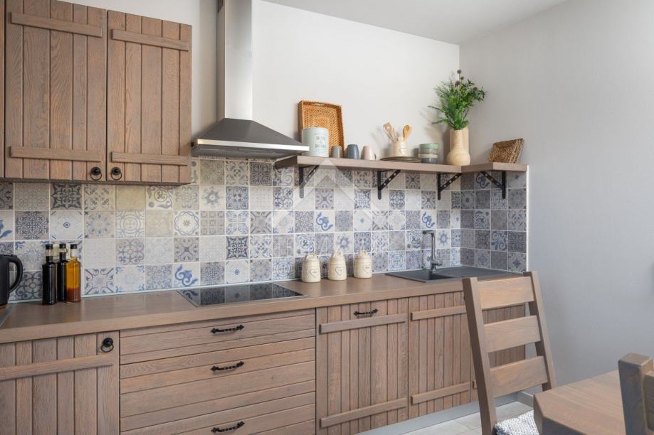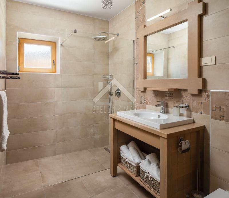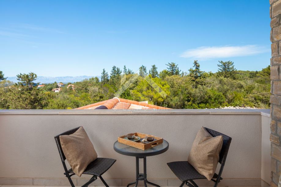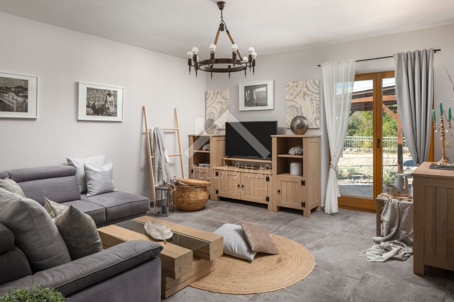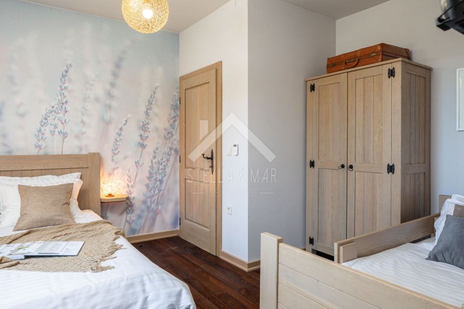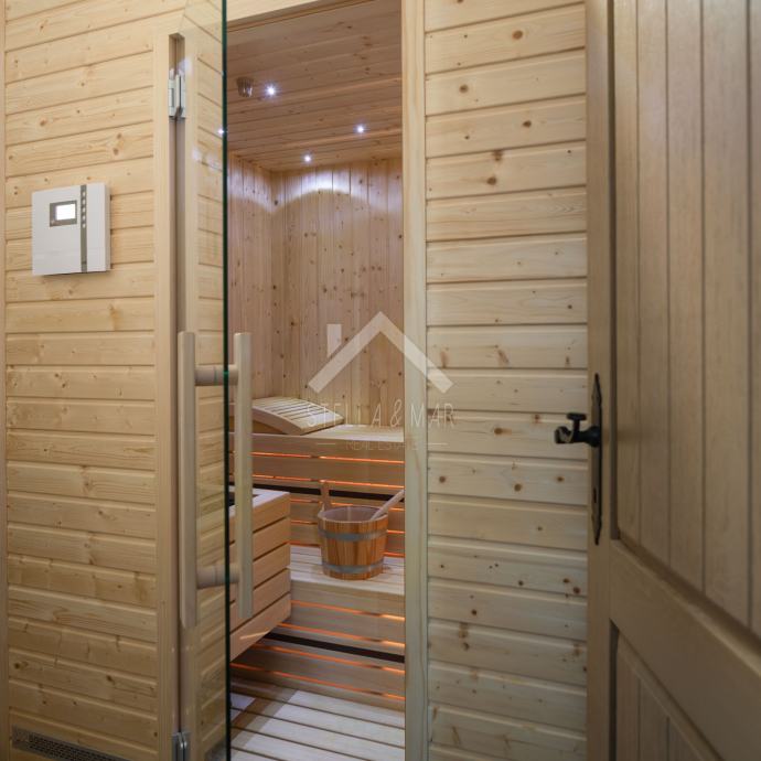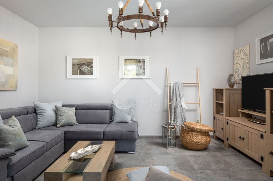 Kamena vila s bazenom luksuzno opremljena, od video nadzora, alarmnog sustava pa do ručno izrađenog namještaja od punog drveta (hrasta) po mjeri i svim aparatima potrebnim za kuću,te finska sauna. Kamena vila udaljena je svega 300 m od mora i plaže, a pruža potpunu intimu boravka, jer nema direktnih susjeda, okružena je mediteranskim raslinjem i maslinama, s pogledom na more i prekrasan okoliš. U dvorištu je uređen vrt s mediteranskim biljem koje se navodnjava vremenskim programiranim upravljačem i vrtna drvena kućica kao spremište. Kuća je izrađena od blok opeke s termo izolacijom od 10 cm, i zidanim prirodnim kamenom debljine 15 cm (NIJE KAMENA OBLOGA), ukupna debljina zida je 55 cm. Prozori, vrata I grilje su također od drveta (hrasta) s troslojnim IZO-staklom, punjen plinom i UV zaštitom.