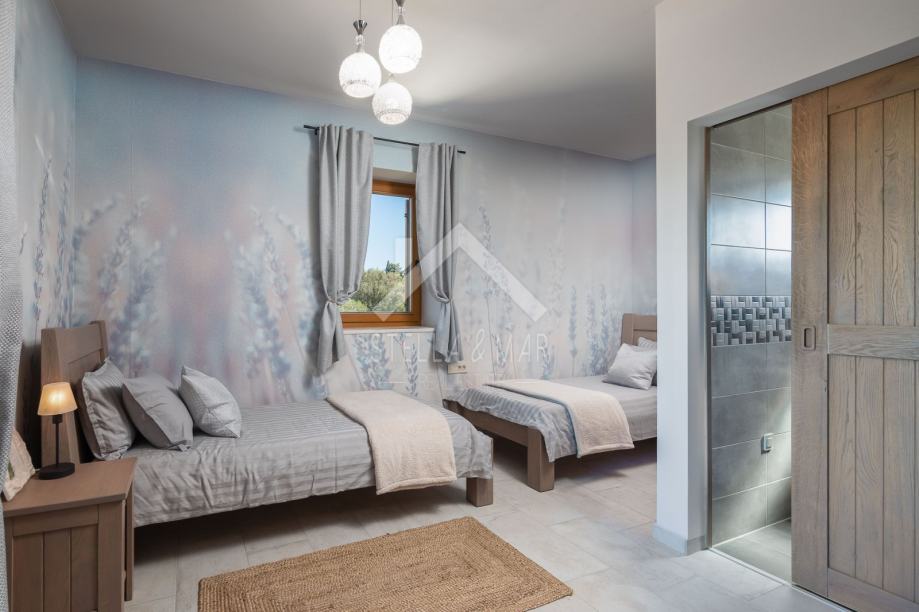 Bazen obložen mozajk keramikom ima mogućnost dogrijavanja i hlađenja, video nadzor, alarmni sustav,programirano navodnjavanje, vrtna kućica kao spremište, do ručno izrađenog namještaja od punog drveta ( hrast ) po mjeri, svaka spavaća soba ima kupaonu s tušem ili hidromasažnom kadom ( četri sobe i četri kupaone ) i finska sauna. Kamena villa udaljena je svega 300 m od mora i plaže, a pruža potpunu intimu nema direktnih susjeda, okružena je mediteranskim raslinjem i maslinama, s pogledom na more i prekrasan okoliš.