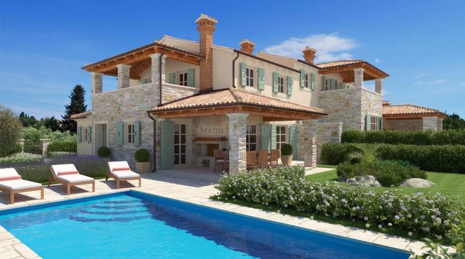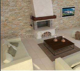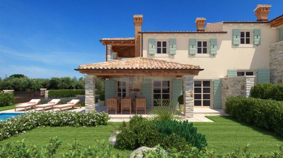 Ova prekrasna kuća proteže se na dvije etaže. Na prvoj etaži nalazi se prostrani dnevni boravak te kuhinja s blagovaonom koja izlazi na prekrasnu sunčanu terasu s pogledom na more od 15 m2, jedne spavaće sobe sa kupaonom, ulaznog prostora, hodnika i ostave što je ukupno 79 m2 stambenog prostora. Druga etaža ima ukupno 57 m2, sastoji se od dvije spavaće sobe od kojih svaka ima svoju privatnu kupaonu, hodnika i natkrivene terase (7,22 m2). Grijanje je podno a kuća je i klimatizirana. Ugrađuje se i unutarnji otvoreni kamin u istarskom stilu obložen kamenom i starim gredama u dnevnom boravku. Vanjski kamin, također u istarskom stilu predviđen je na terasi. Parkirno mjesto osigurano pod nadstrešnicom. Čisto vlasništvo i uredni papiri gradnje. Useljenje u ljeto 2018. godine.