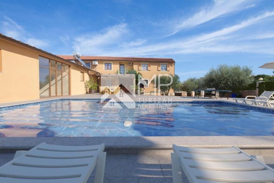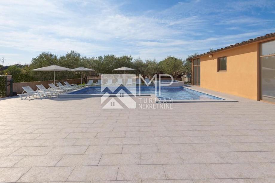 Zgrada kao takva ima 500 m2 stambene površine na dvije etaže + 225 m2 hale koja je trenutno neiskorištena ( s puno potencijala za dodatno opremiti – npr. unutarnji wellness ili još smještajnih jedinica ili nadogradnjom zgrade ). Dvorište ima 900 m2, ima 40 maslina, bazen površine 70 m2 sa plitkim dijelom za djecu i jaccuzijem.
