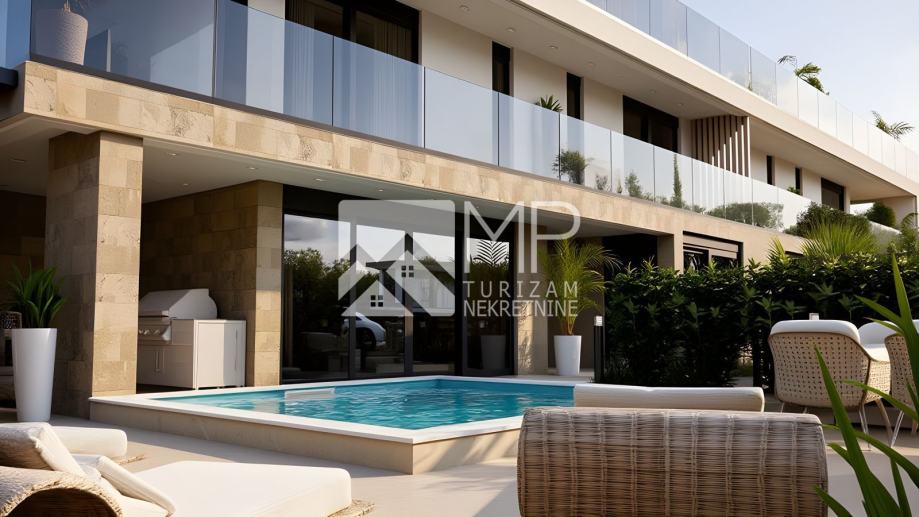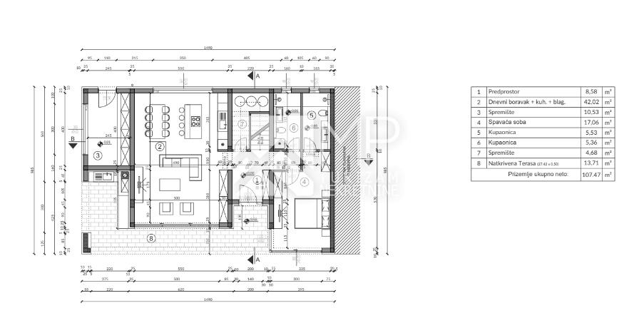 U prizemlju ( 107,47 m 2 ) će se nalaziti prostrani dnevni boravak koji je po open space konceptu izvrsno spojen sa kuhinjom i blagovaonom i natkrivenom terasom, spavaća soba sa vlastitom kupaonicom, još jedna kupaonica te 2 spremišta.