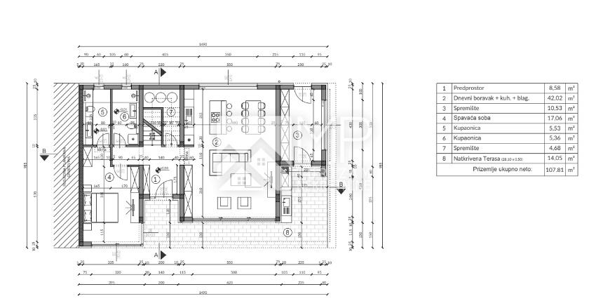 U prizemlju ( 107,81 m 2 ) će se nalaziti prostrani dnevni boravak koji je po open space konceptu izvrsno spojen sa kuhinjom i blagovaonom i natkrivenom terasom, spavaća soba sa vlastitom kupaonicom, još jedna kupaonica te 2 spremišta.