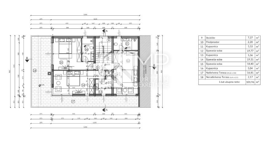 Na I. katu ( 101,96 m2 ) se nalaze tri spavaće sobe, od kojih svaka ima svoju kupaonicu, te nenatkrivena terasa.