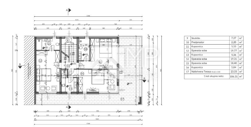 Na I. katu ( 106,31 m2 ) se nalaze tri spavaće sobe, od kojih svaka ima svoju kupaonicu, te natkrivena terasa.