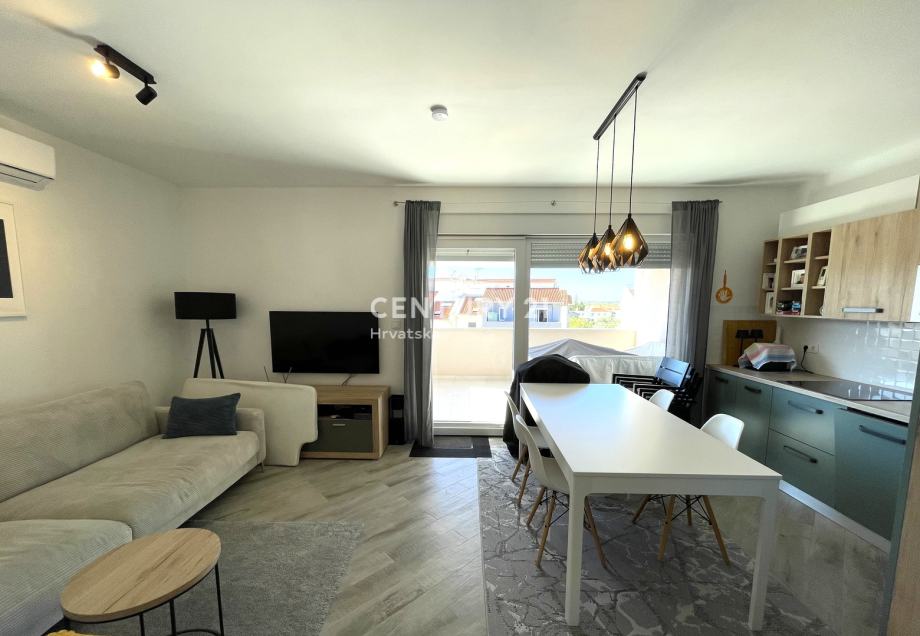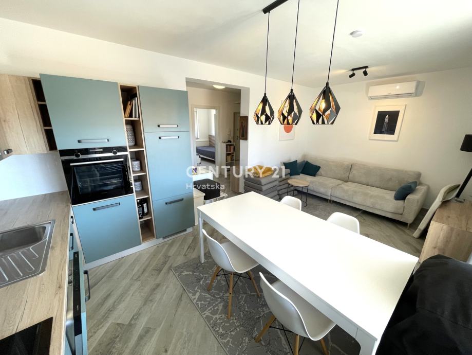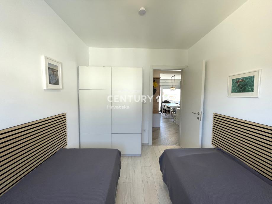 Stan je moderan, svijetao i osunčan, a sastoji se od kuhinje s blagovaonicom i dnevnim boravkom iz kojih se izlazi na prostranu natkrivenu terasu, dvije spavaće sobe te kupaonice.