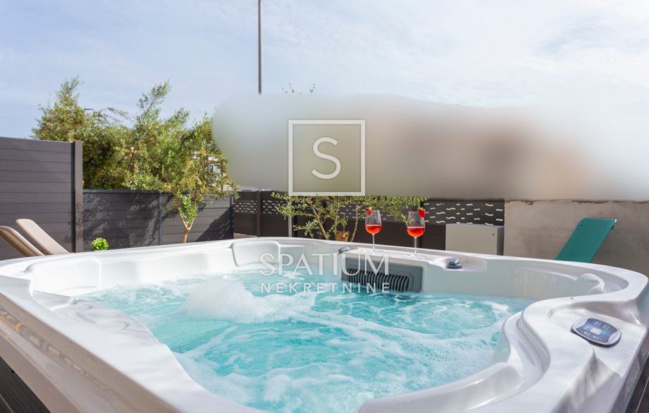 U lijepo uređenom mediteranskom vrtu s maslinama i sustavom navodnjavanja nalazi se jacuzzi, koji dodatno doprinosi luksuznom ugođaju.
