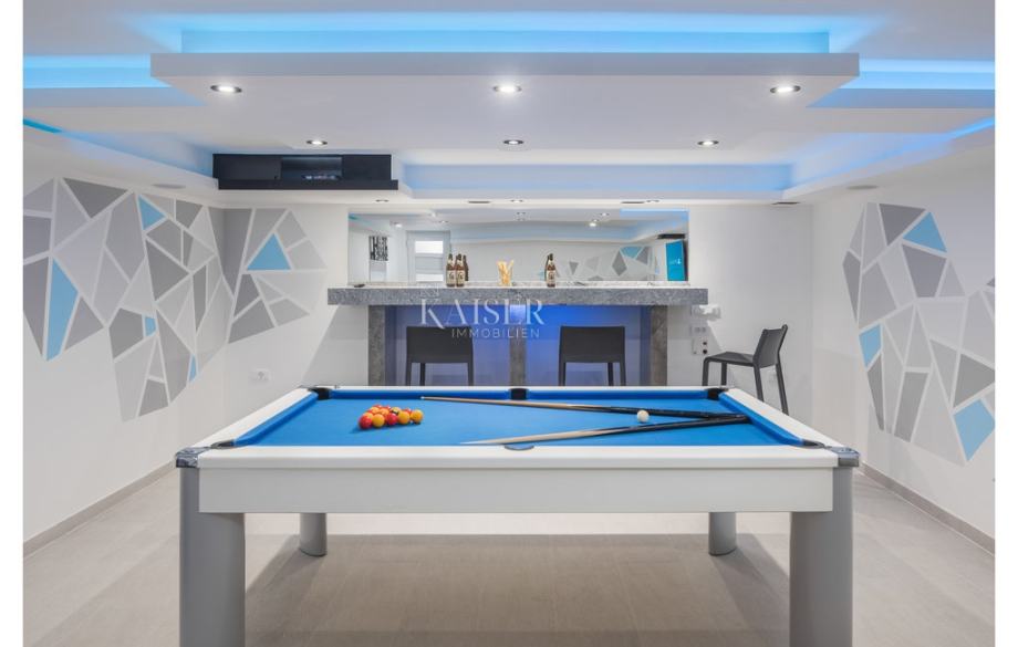 Smještena na parceli površine 571m2, ukupne stambene površine 270m2, objekt ima dva apartmana od kojih je veći apartman razveden na dvije etaže. U prizemlju je dnevni prostor sa boravkom, kuhinjom i blagovaonicom. Na katu se nalaze četiri spavaće sobe i četiri kupaonice, te terasa sa koje se pruža predivan panoramski pogled na more i otočiće medulinskog arhipelaga. Drugi apartman sastoji se od kuhinje s blagovaonicom i dnevnog boravka, spavaće sobe, kupaonice, terase s hidromasažnim bazenom i pogledom na more.